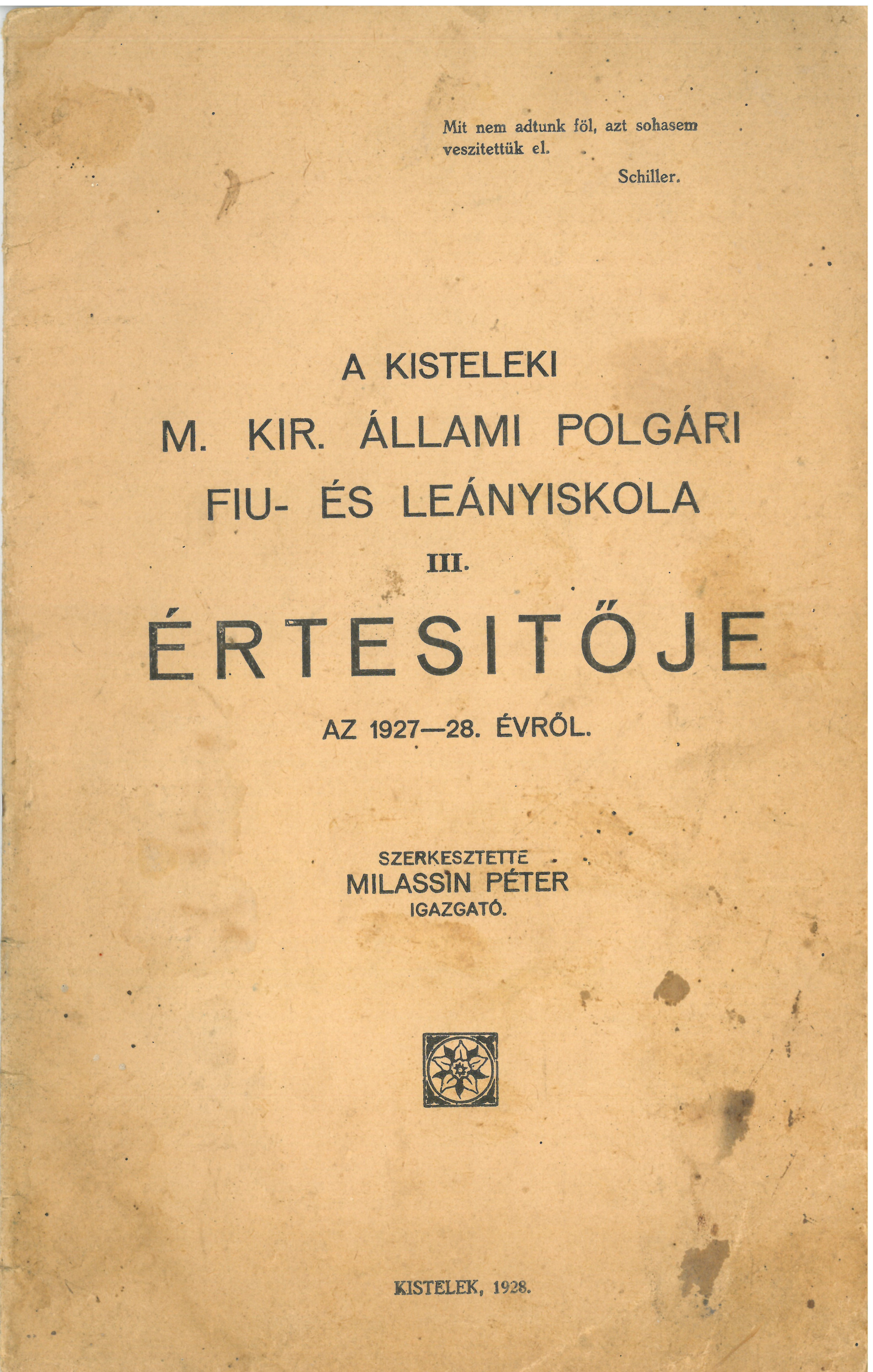 A Kisteleki M. Kir. Állami és Polgári Fiú- és Leányiskola Értesítője az 1927/1928-as tanévről. Milassin Péter igazgató szerkesztésében.