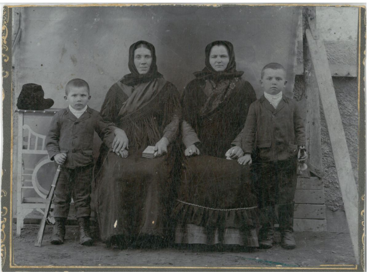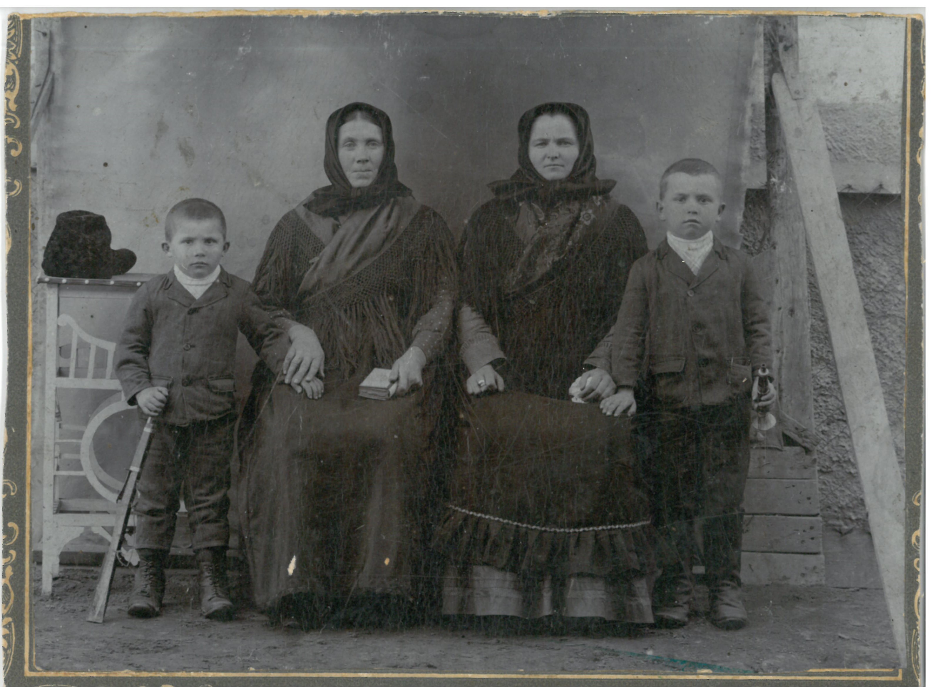 Asszonyok gyerekekkel, egész alakos, kültéren, háttérrel készített családi portré. Beállított frontális pózban, szimmetrikus kompozícióban. A kisfiúk kezében játék fapuska és trombita. Az idősebb asszony kezében imakönyv. Kartonra ragasztott.