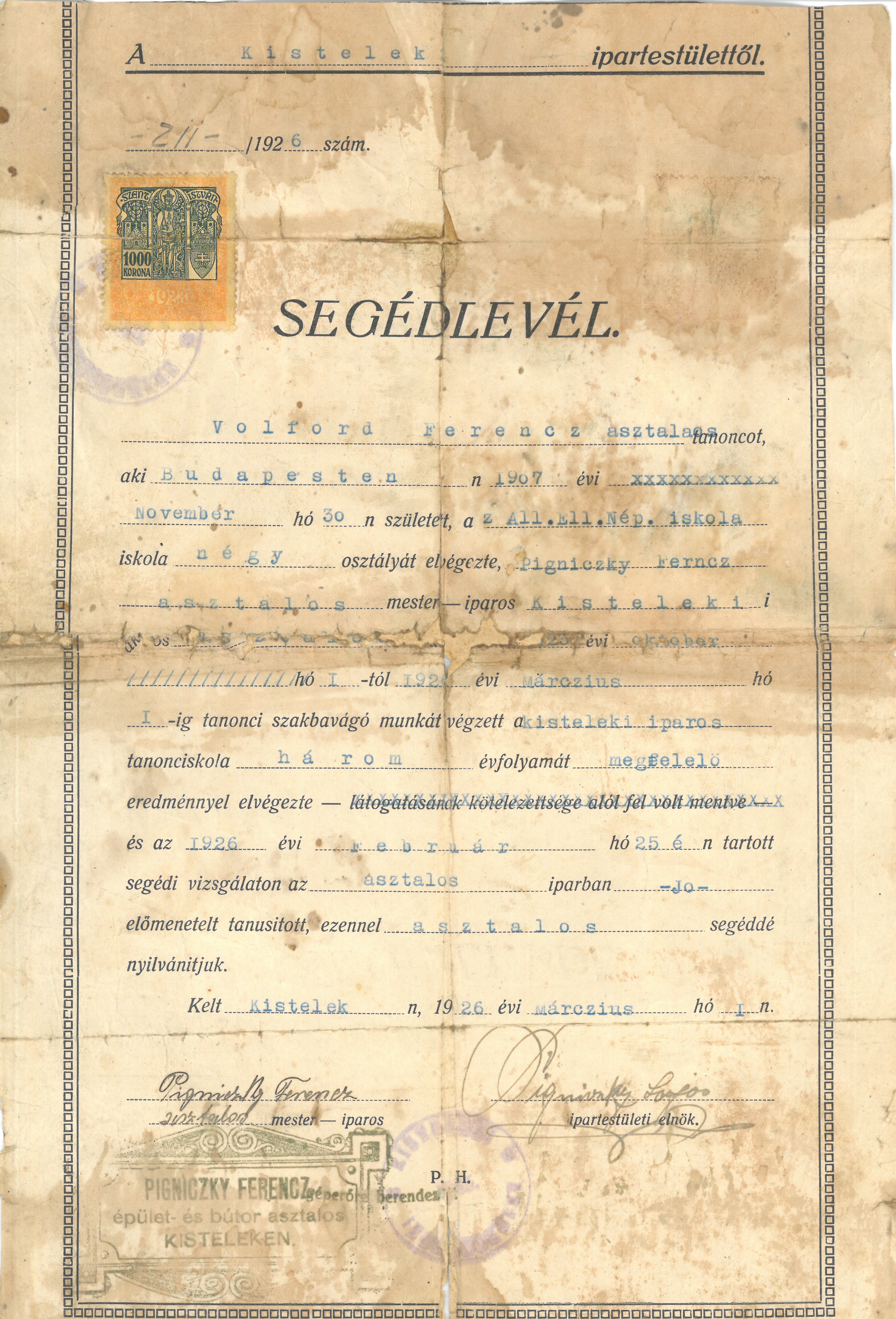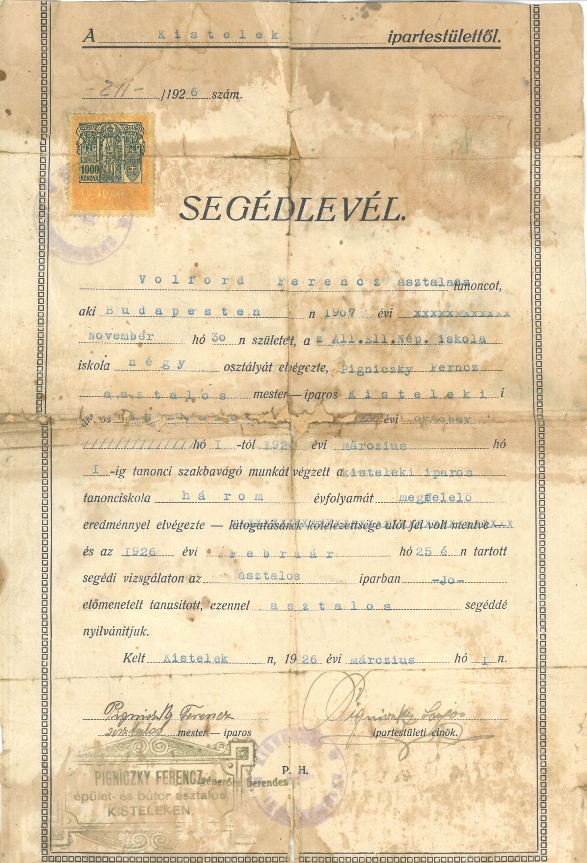 Volford Ferenc asztalos tanonc segédlevele, Pigniczky Ferecz asztalos mester és Pigniczky Lajos-ipratestületi elnök aláírásával.