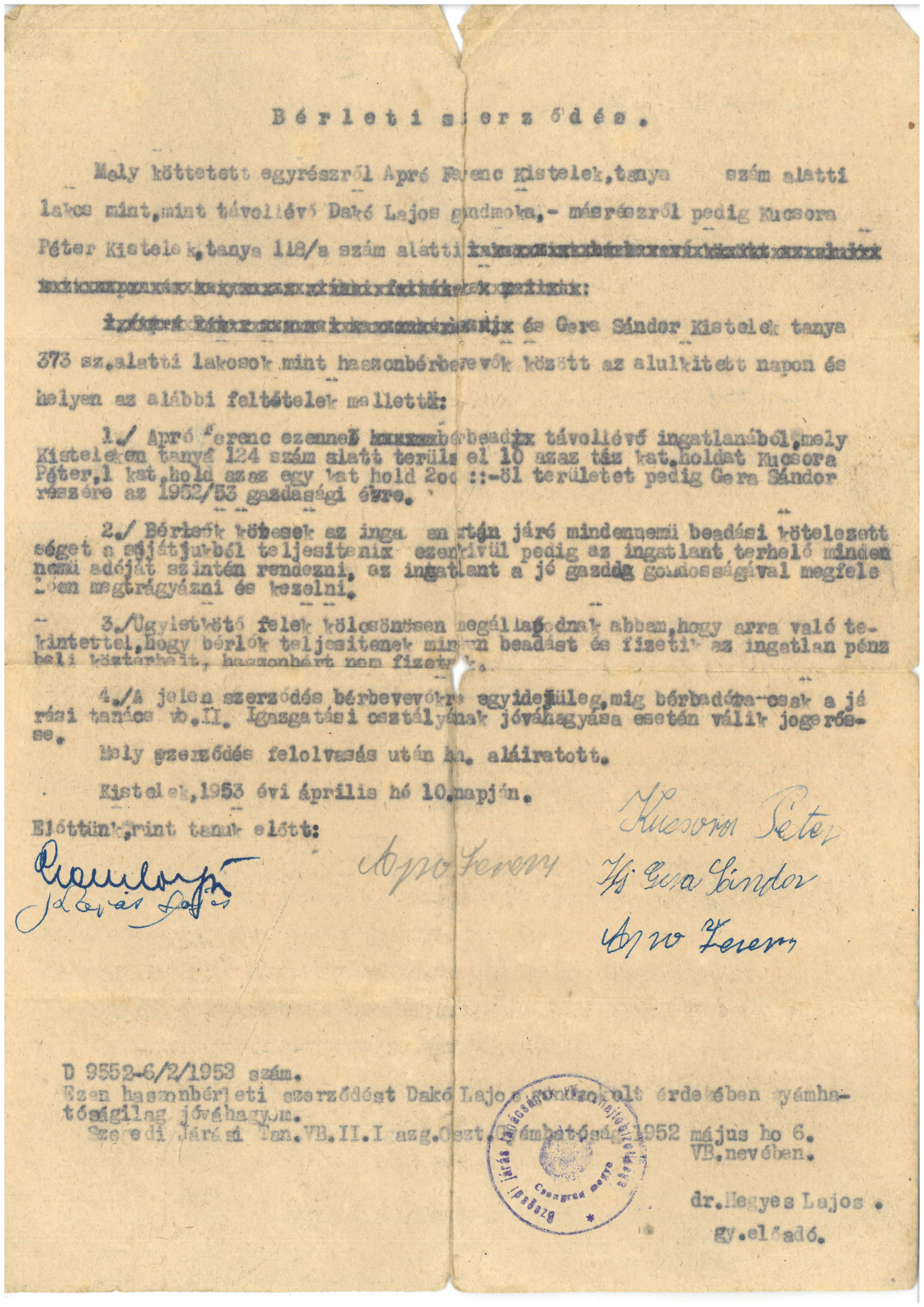 Haszonbérleti szerződés a Kistelek, Tanya 124. szám alatti terület 1952/53. gazdasági évre történő haszonbérbe adásáról.