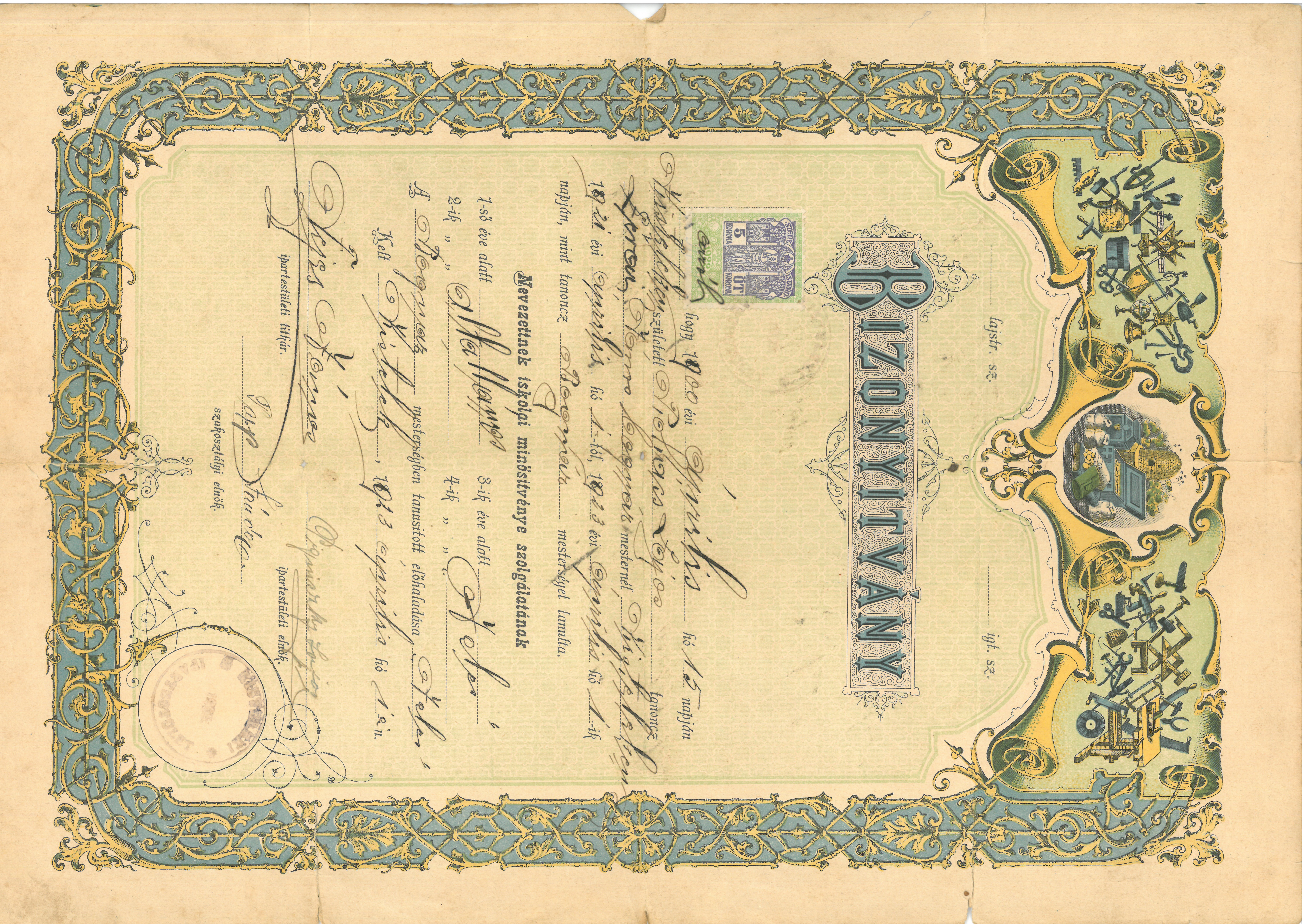 Rohács Lajos bizonyítványa bognár mesterségről, 1923-ból. Díszes előnyomott oklevél.