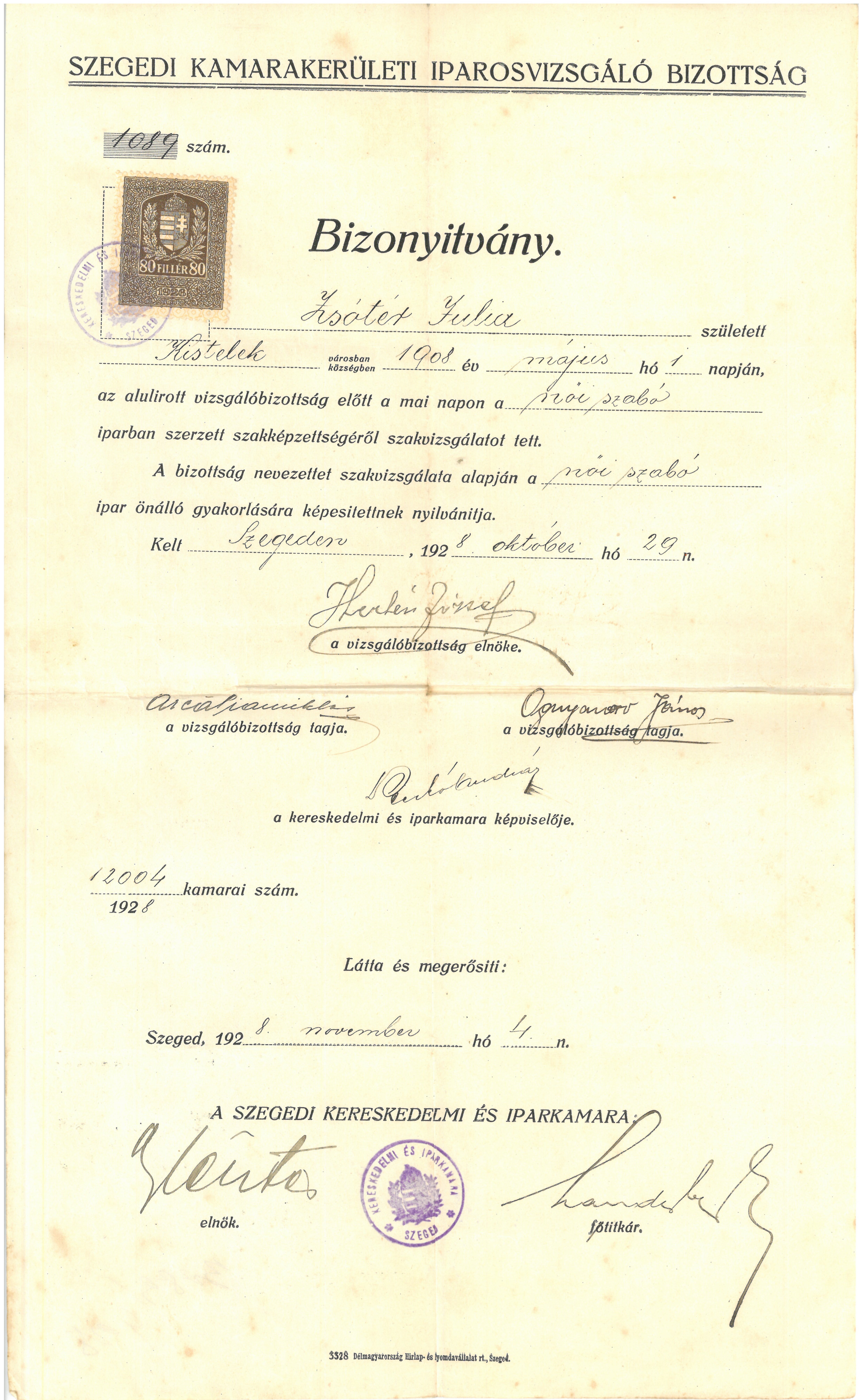Zsótér Júlia női szabó képesítését igazoló bizonyítvány 1928-ból, a Szegedi Kereskedelmi és Iparkamara pecsétjével.