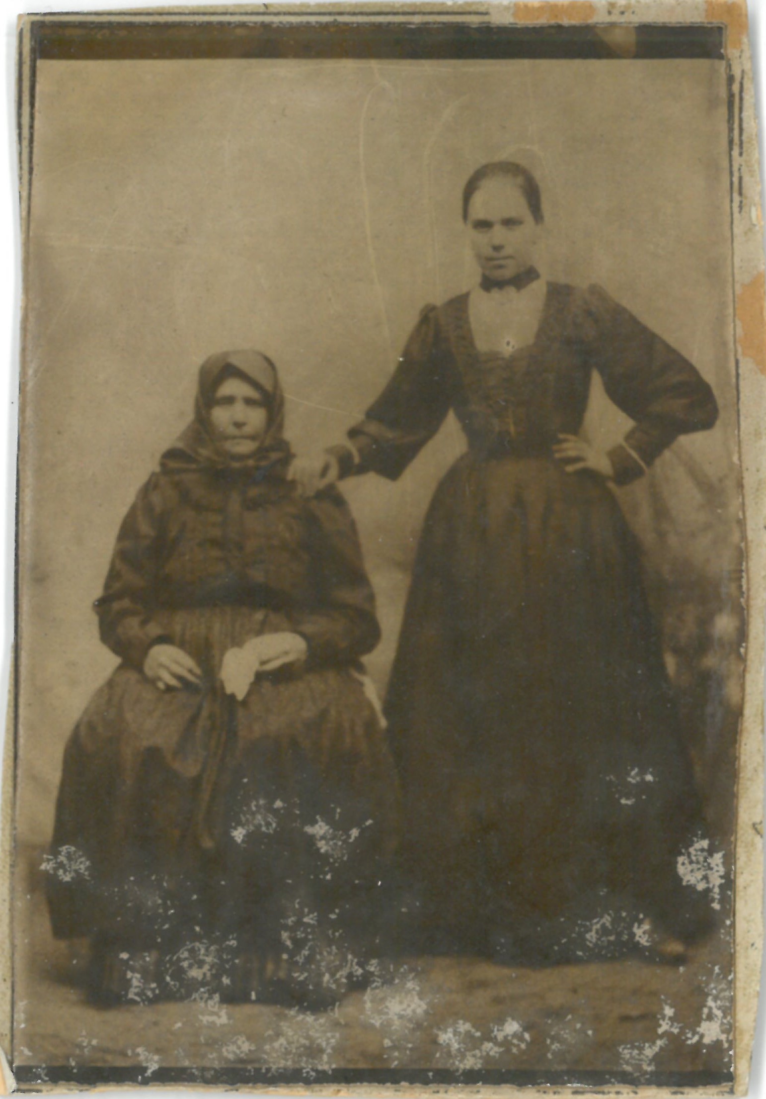 Egész alakos portré, idős és fiatal nőről (édesanya lányával ?). Műtermi fotó. Kartonra ragasztott.