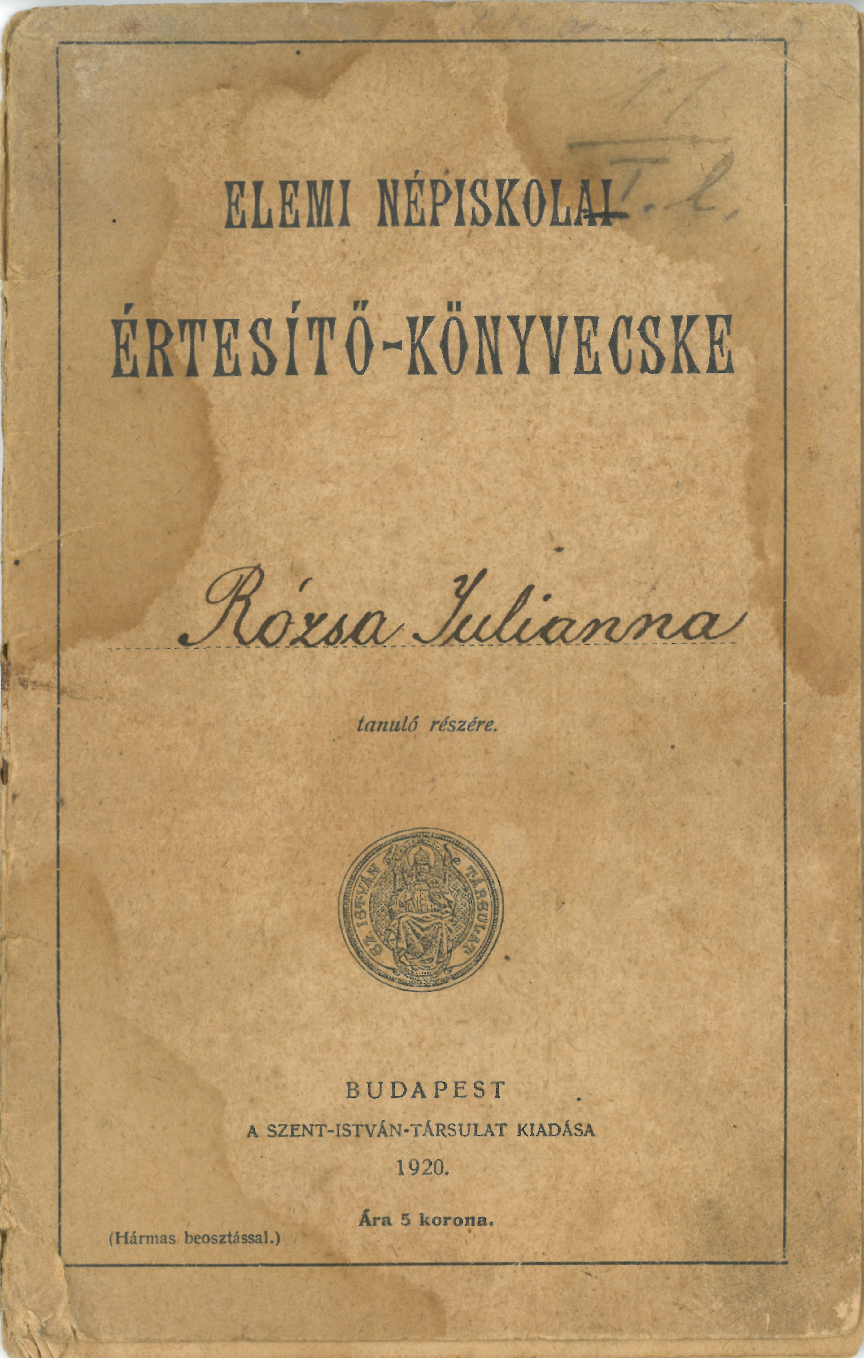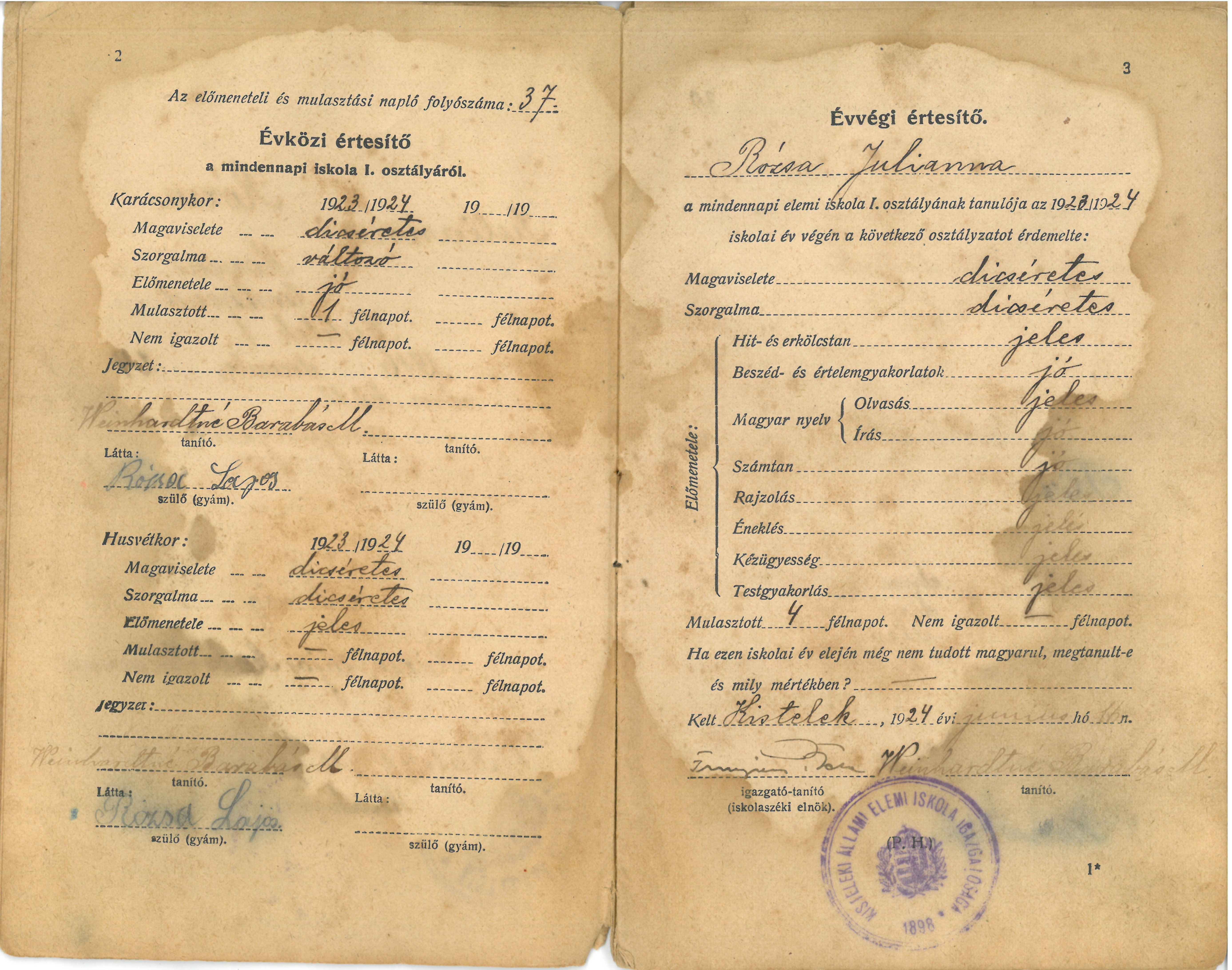 Rózsa Julianna elemi népiskolai értesítője az 1923-1927 közötti időszakból, Weinhardtné Barabás Margit tanító aláírásával.