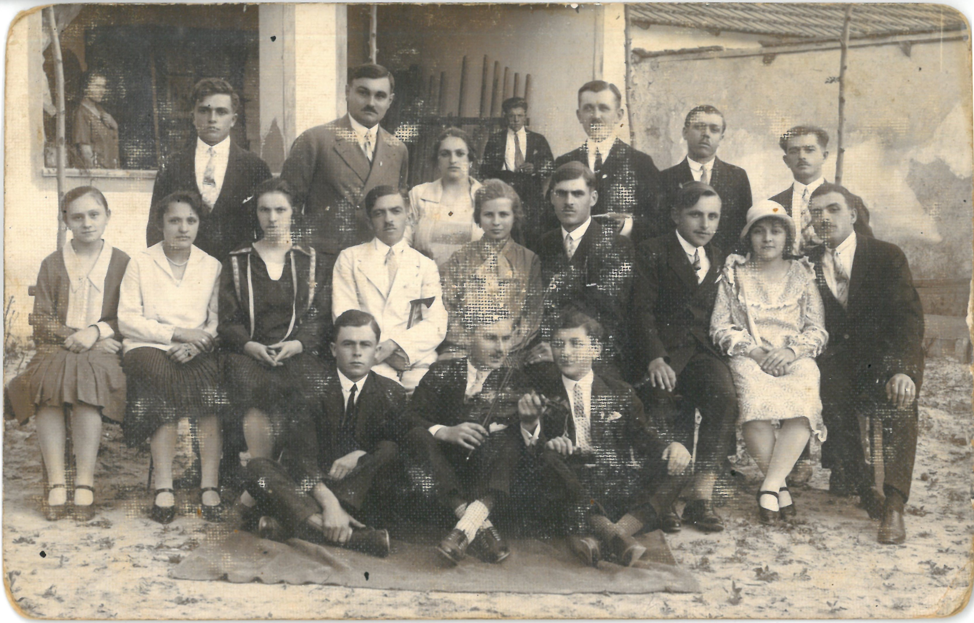 Fiatal nők és férfiak ünneplőben, csoportkép épülettel a háttérben. Készítette: Müller fényképész, Kistelek. A kép hátoldala levelezőlap, felirat: Kistelek, 1930. V. 20.