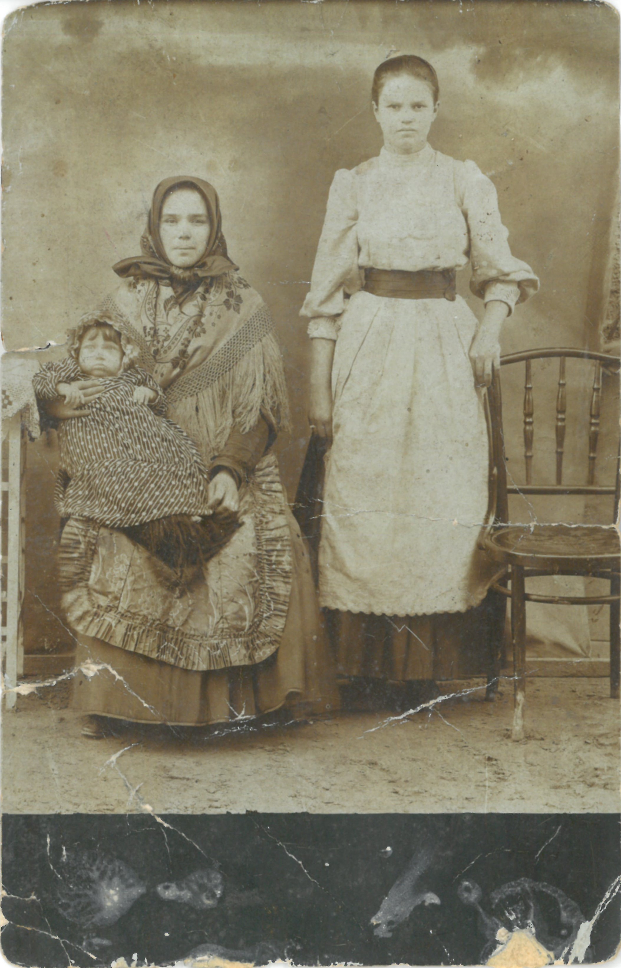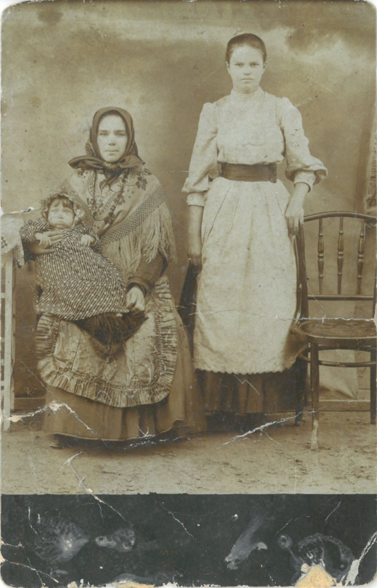 Fiatalasszony, kezében kisgyermekkel, mellette fiatal lány. (Édesanya lányaival?) Egész alakos műtermi portré, thonet székkel. Képeslap hátlappal. Ceruzával ráírva: Buknicz Eszter