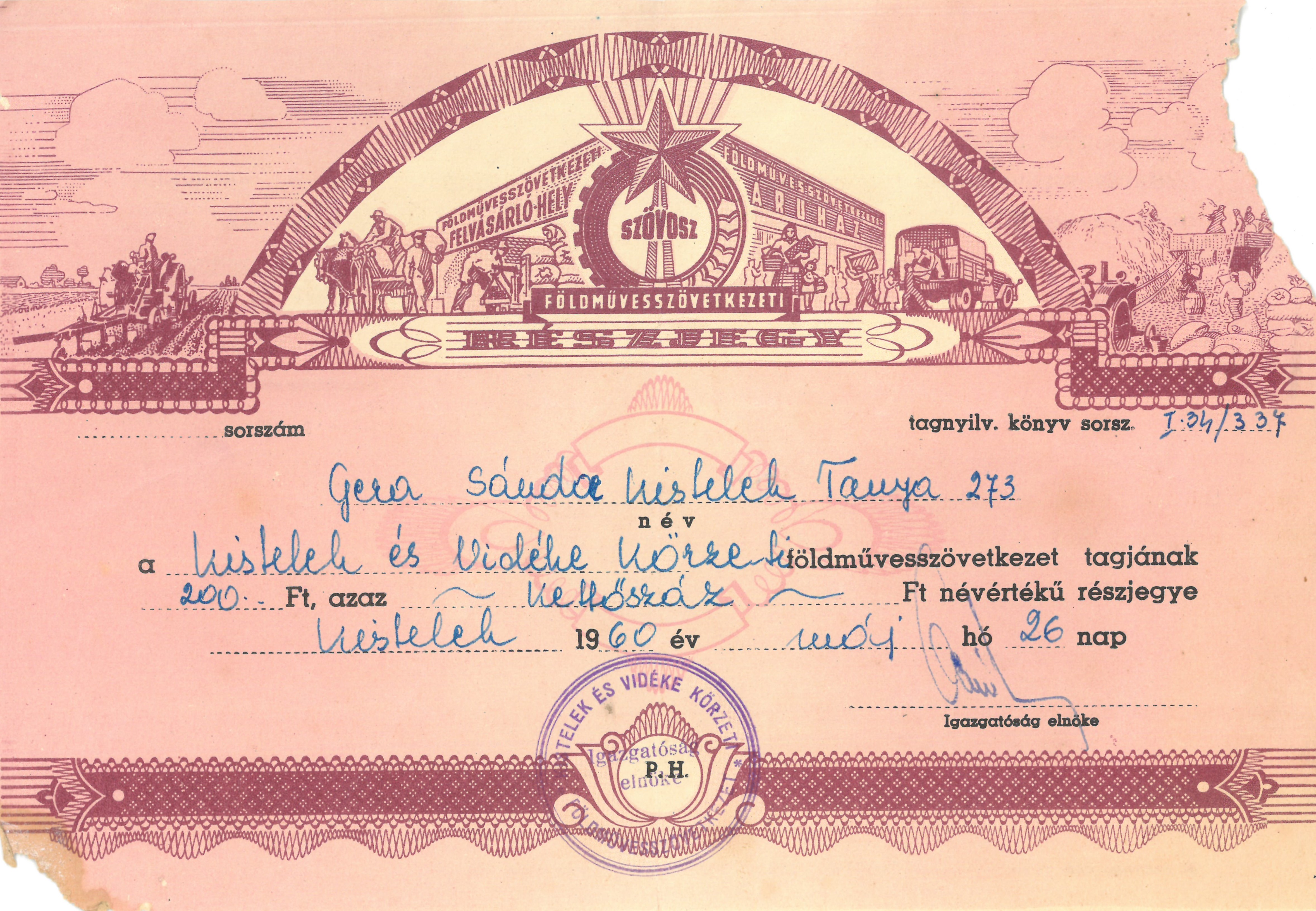 Gera Sándor a Kistelek és Vidéke Körzeti Földművesszövetkezet tagjának részjegye.