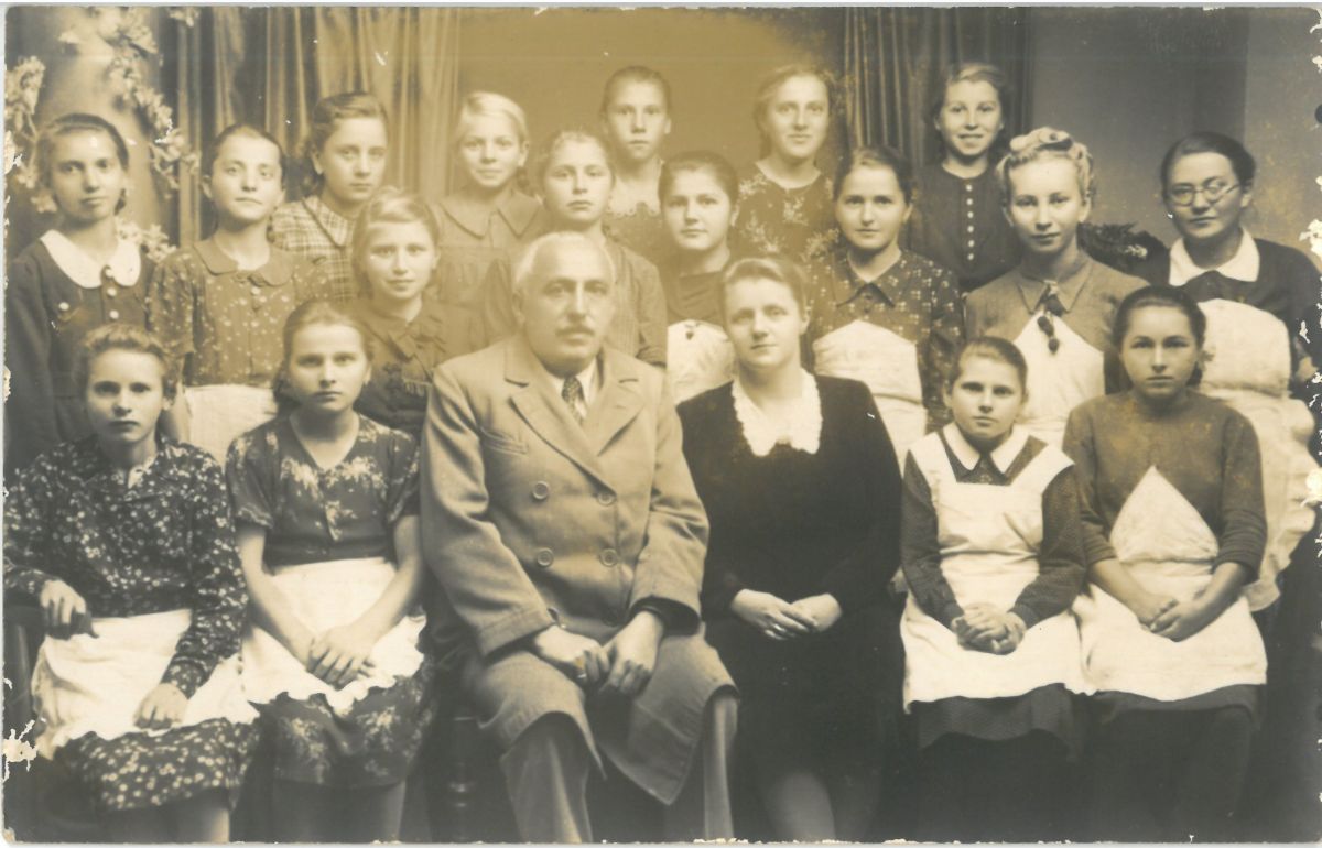 Főzőtanfolyam növendékei. Hátoldalán levelezőlap felirattal: 1941. okt. 14. Főzőtanfolyam növendékei. Mester Nándorné. Szentes, Mentő u. 43.