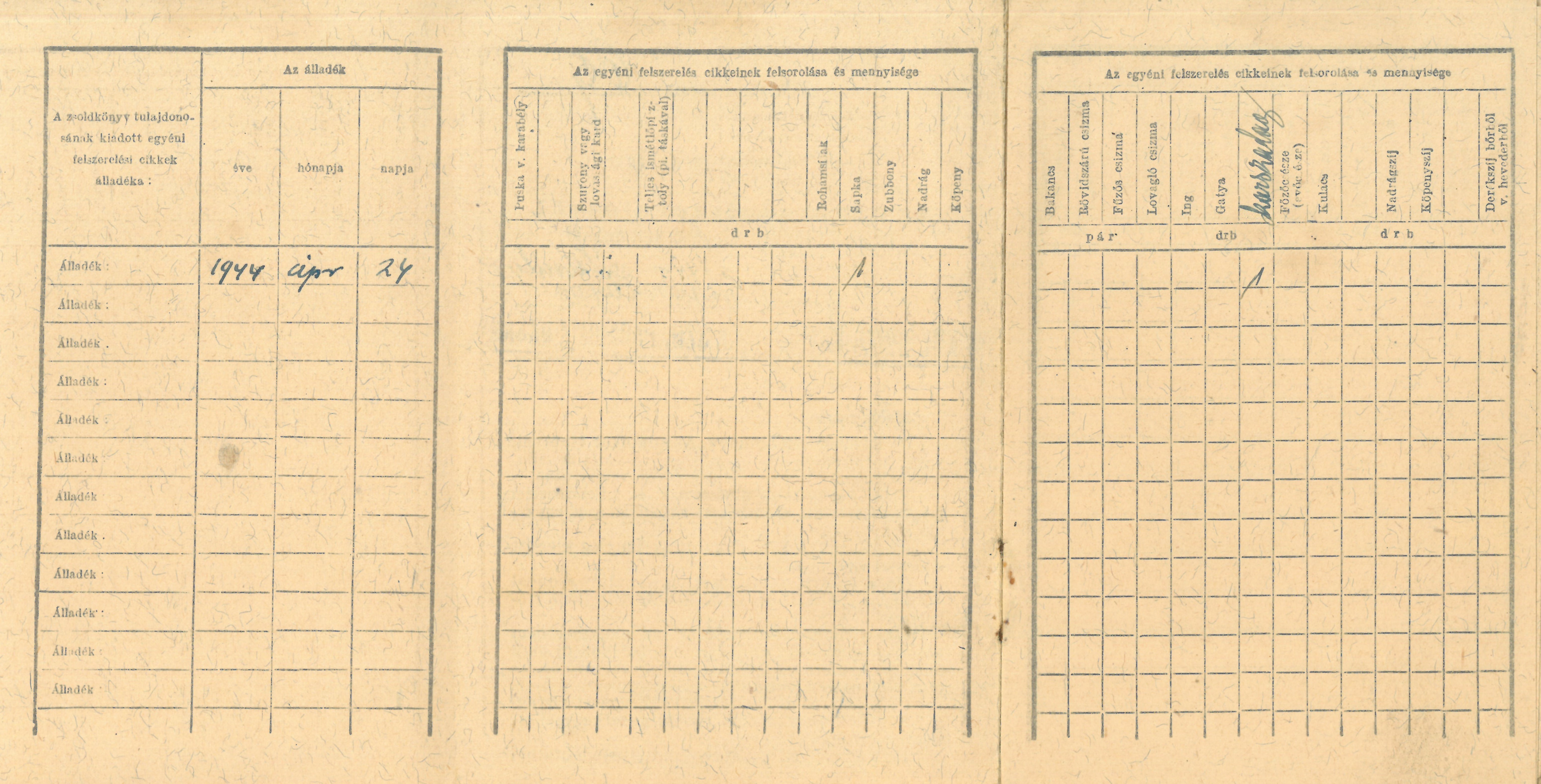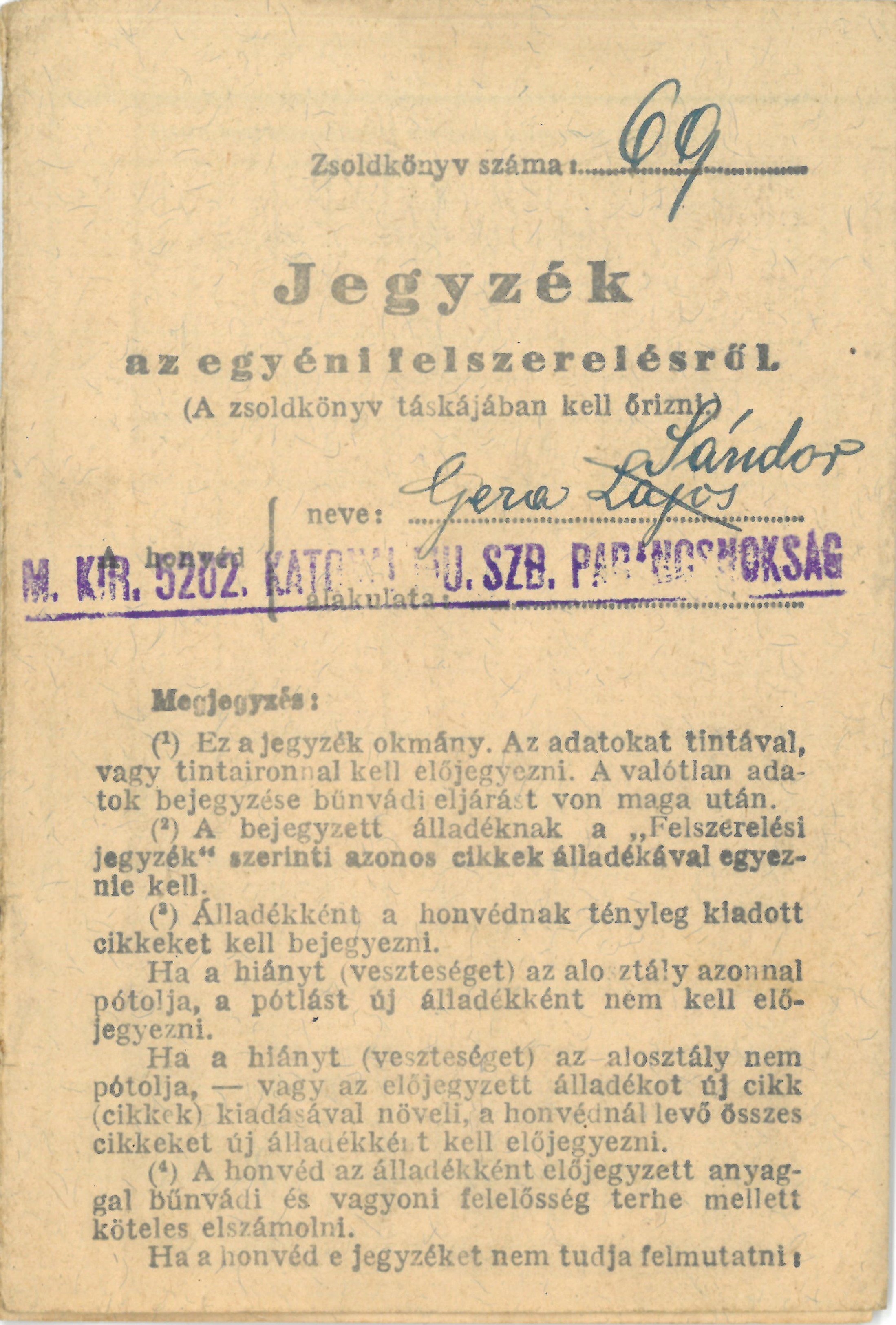 Zsoldkönyvhöz tartozó jegyzék az egyéni felszerelésekről.