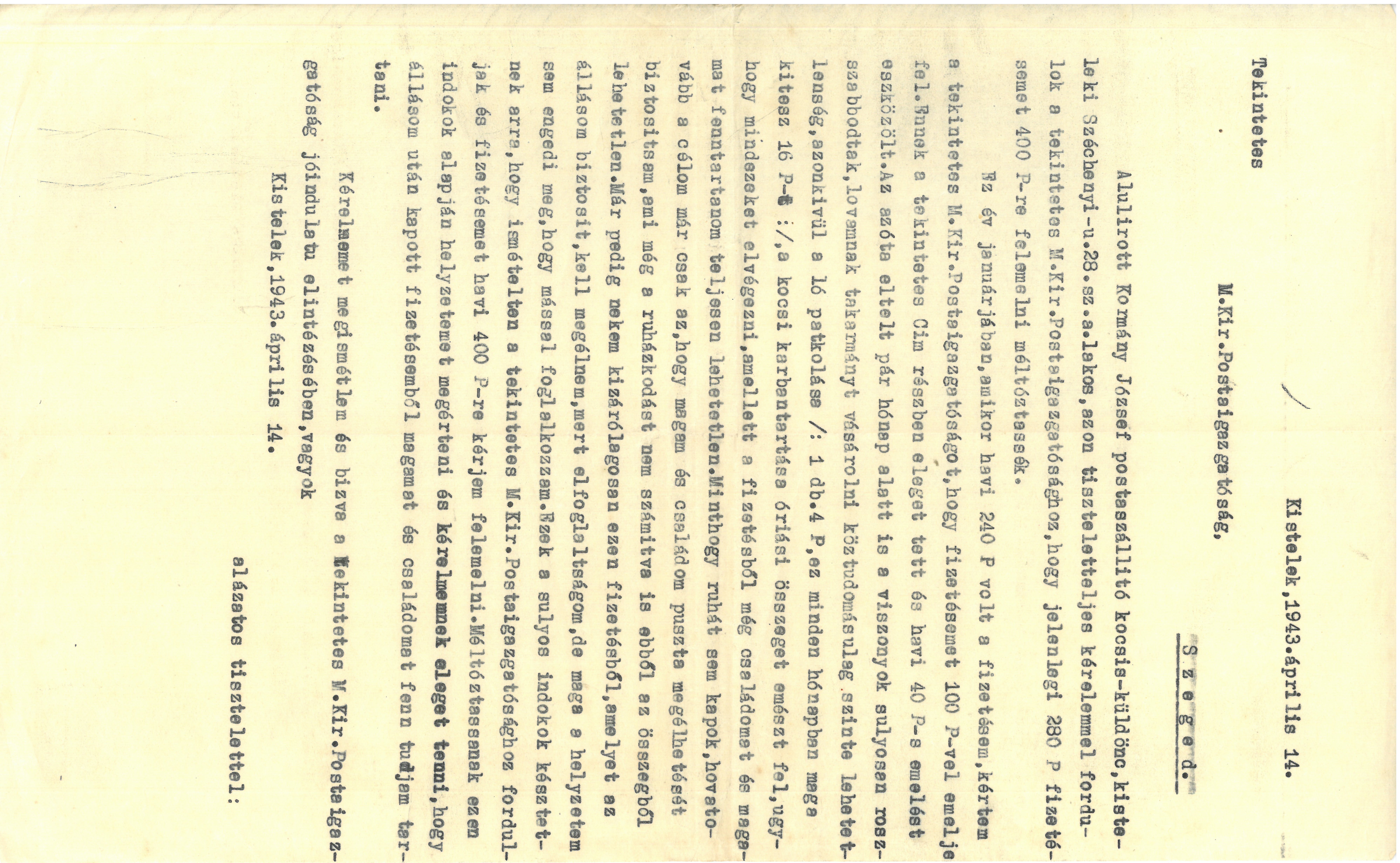 Kormány József postaszállító-kocsis kérelme munkáltatójához: a M. Kir. Postaigazgatósághoz, fizetés emelés ügyében 1943. április 14. keltezéssel.
