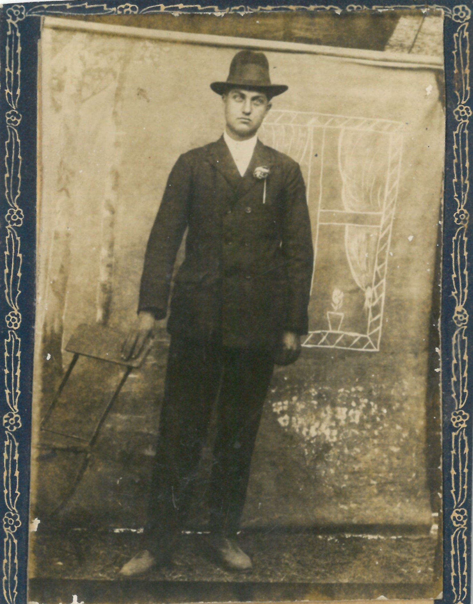 Műteremben készült, egész alakos fiatal férfi portré. Paszpartus. Festett fotóháttérrel.