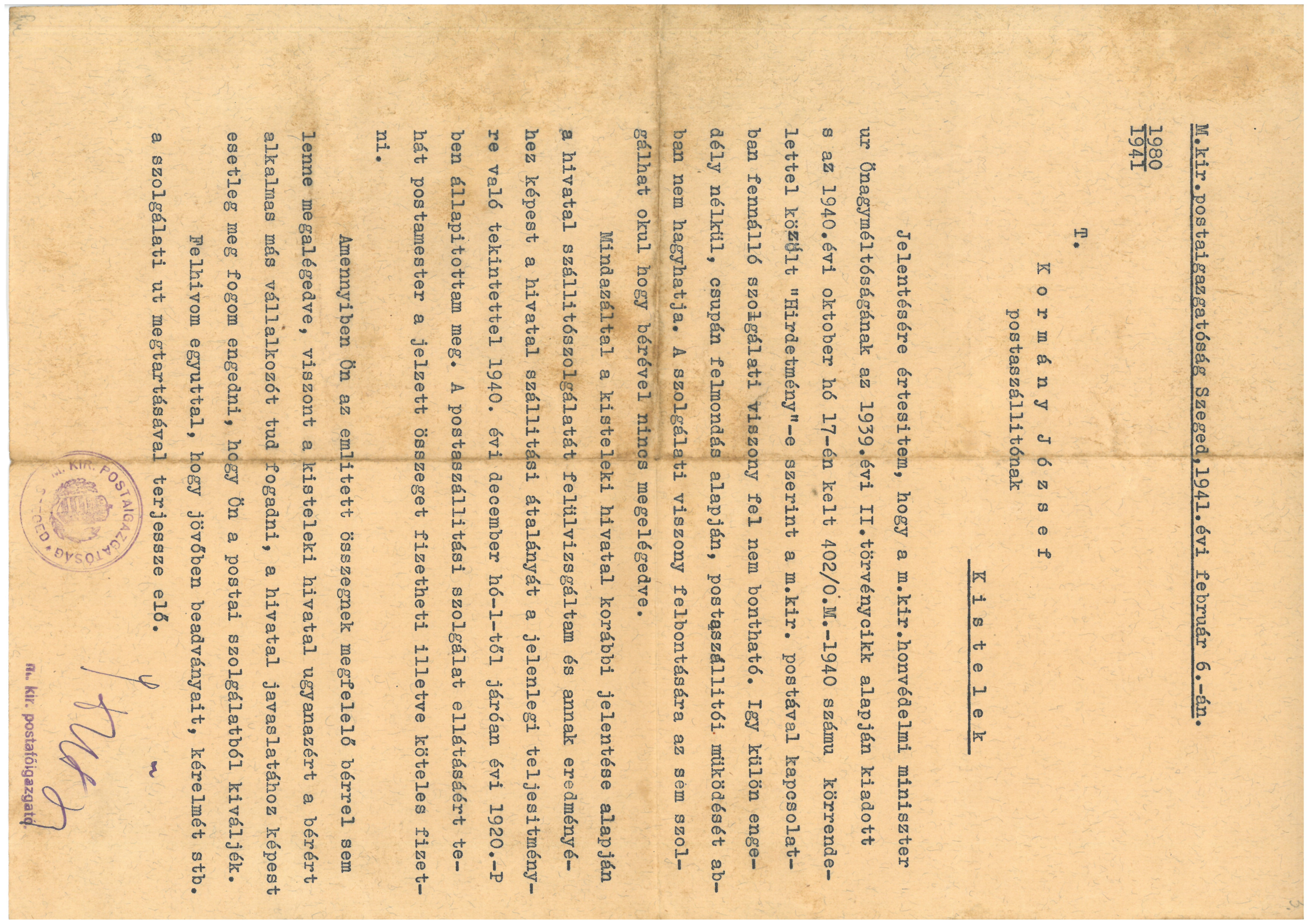 M. kir. Postaigazgatóság válasza Kormány József kérelmére, 1941. február 6-án.