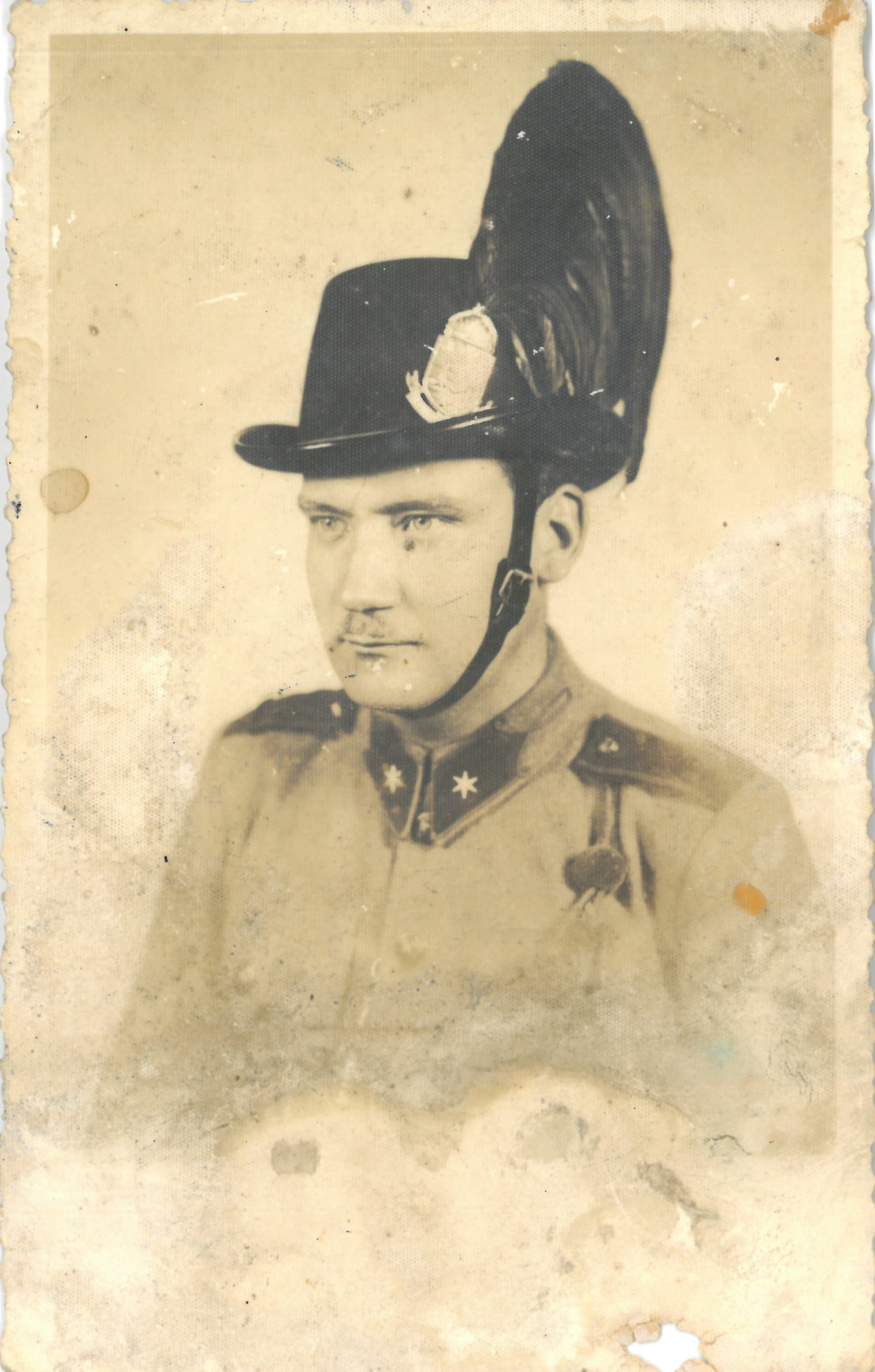 Magyar csendőr egyenruhában, kakastollas kalapban.