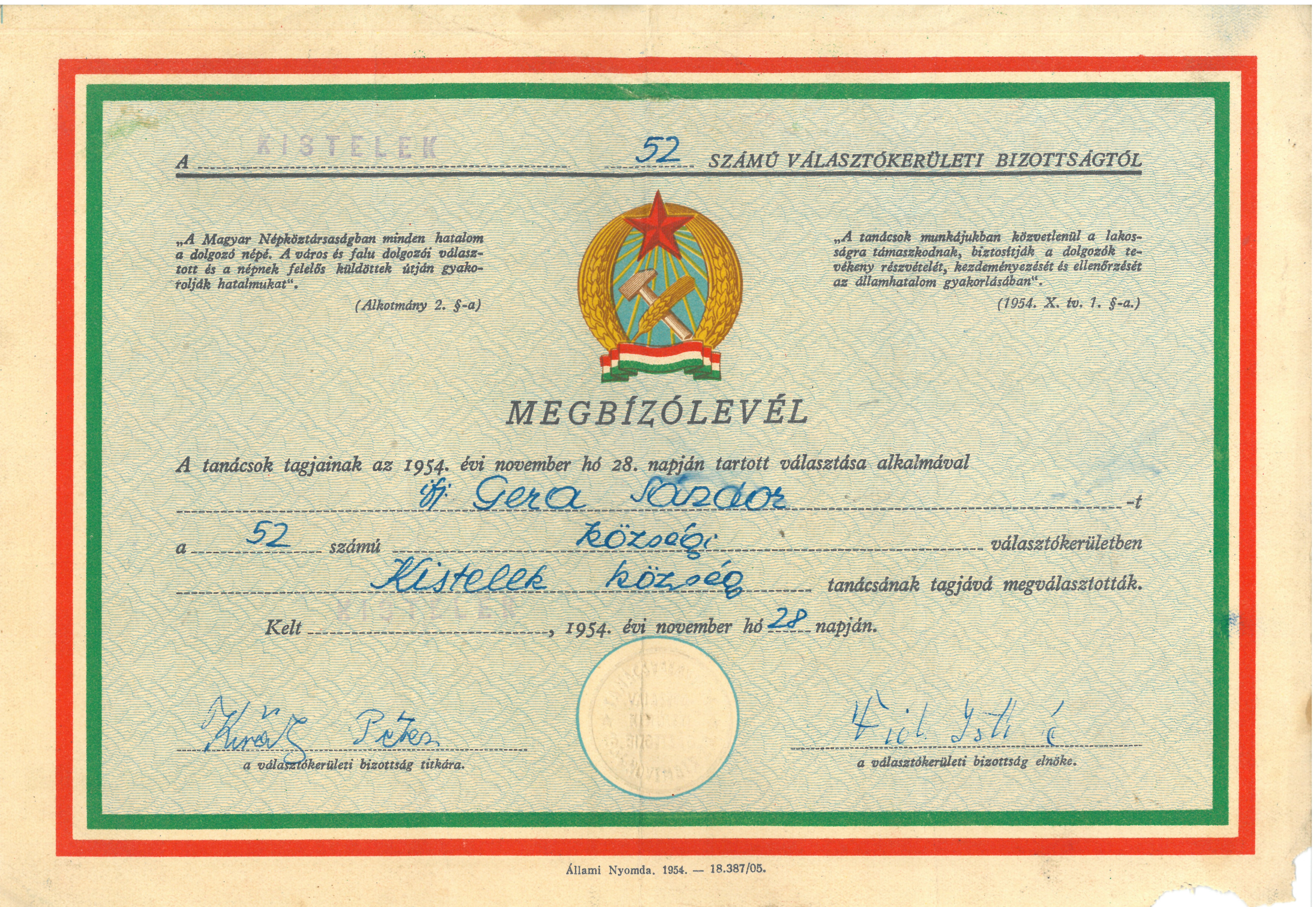 Megbízólevél ifj. Gera Sándor Kistelek község tanács tagjának megválasztásáról.