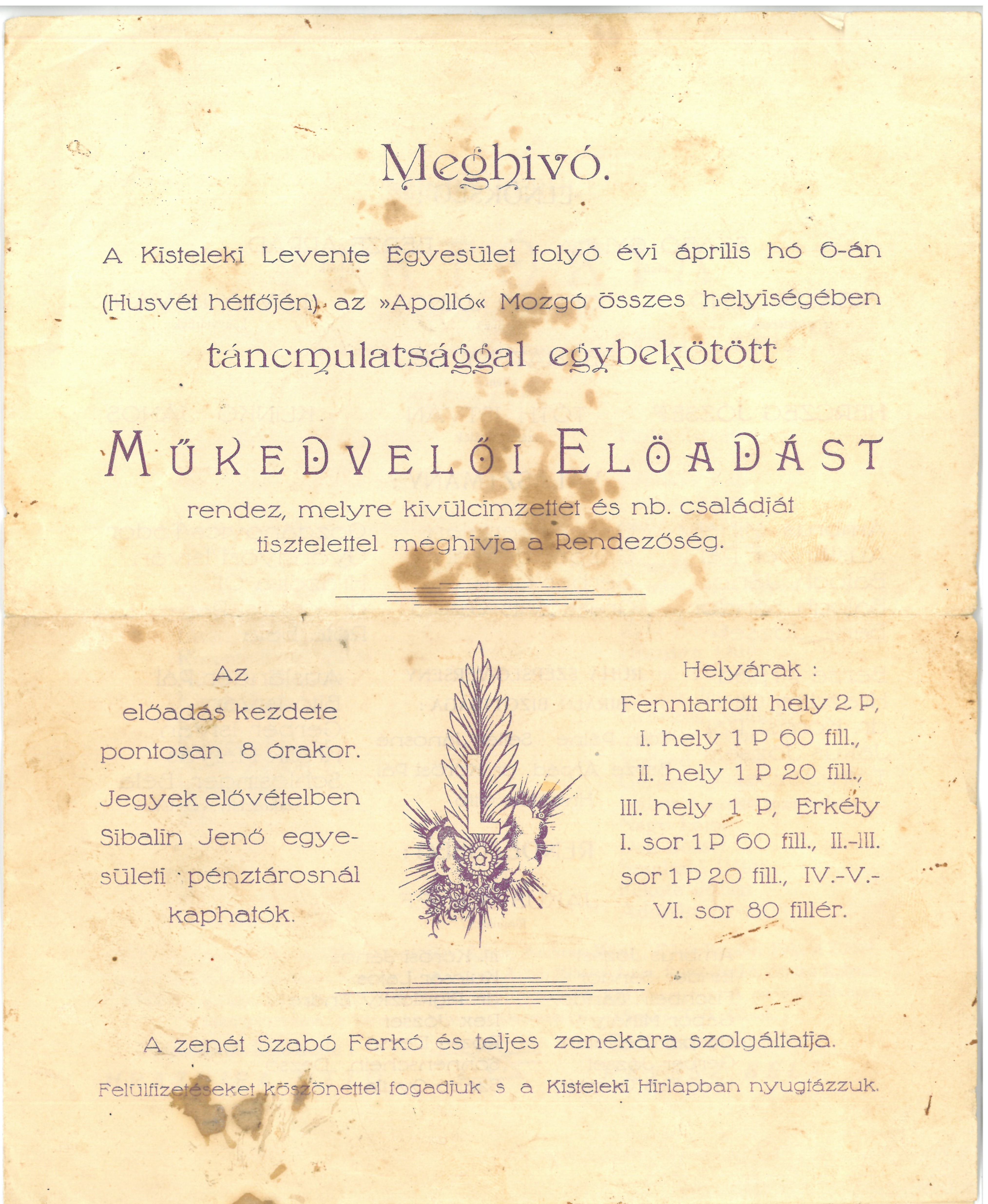 A Kisteleki Levente Egyesület meghívója táncmulatsággal egybekötött műkedvelői előadásra.