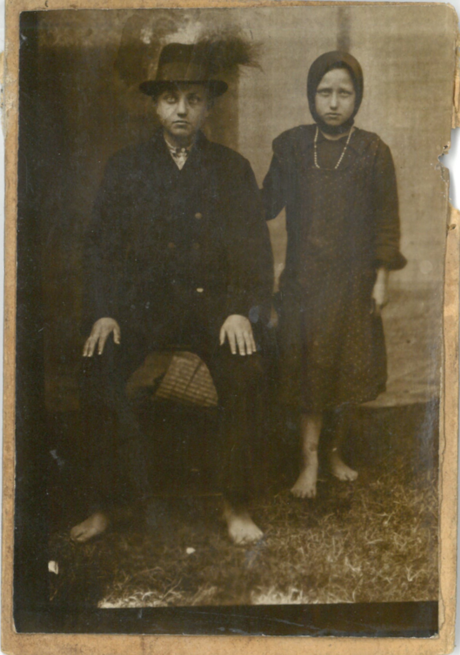 Egész alakos portré. Mezítlábas fiatal fiú és leány ( testvérpár ?) házfal előtt fényképezve. Kartonra ragasztott.