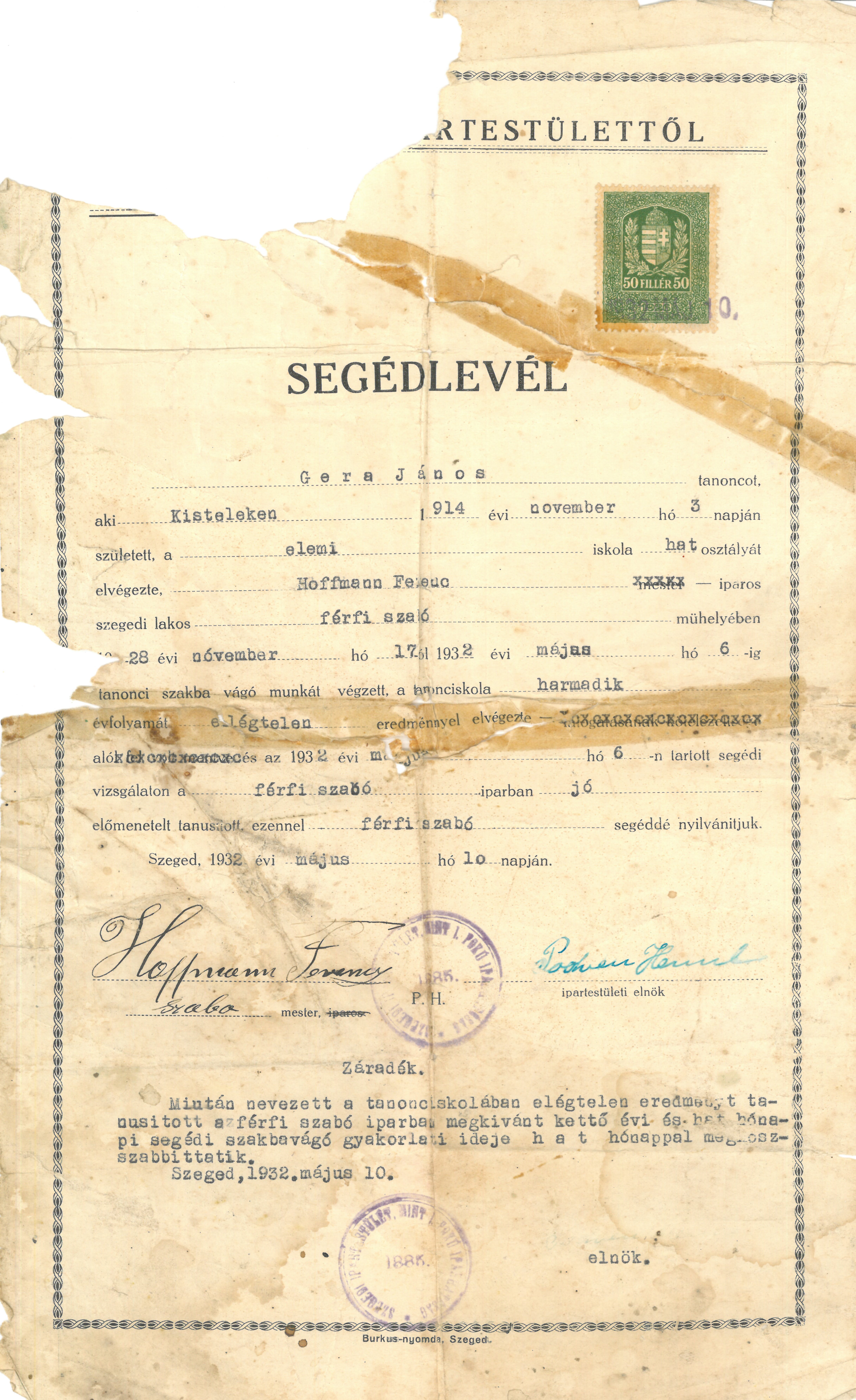 Gera János férfiszabó segéd segédlevele 1932. május 10. keltezéssel.