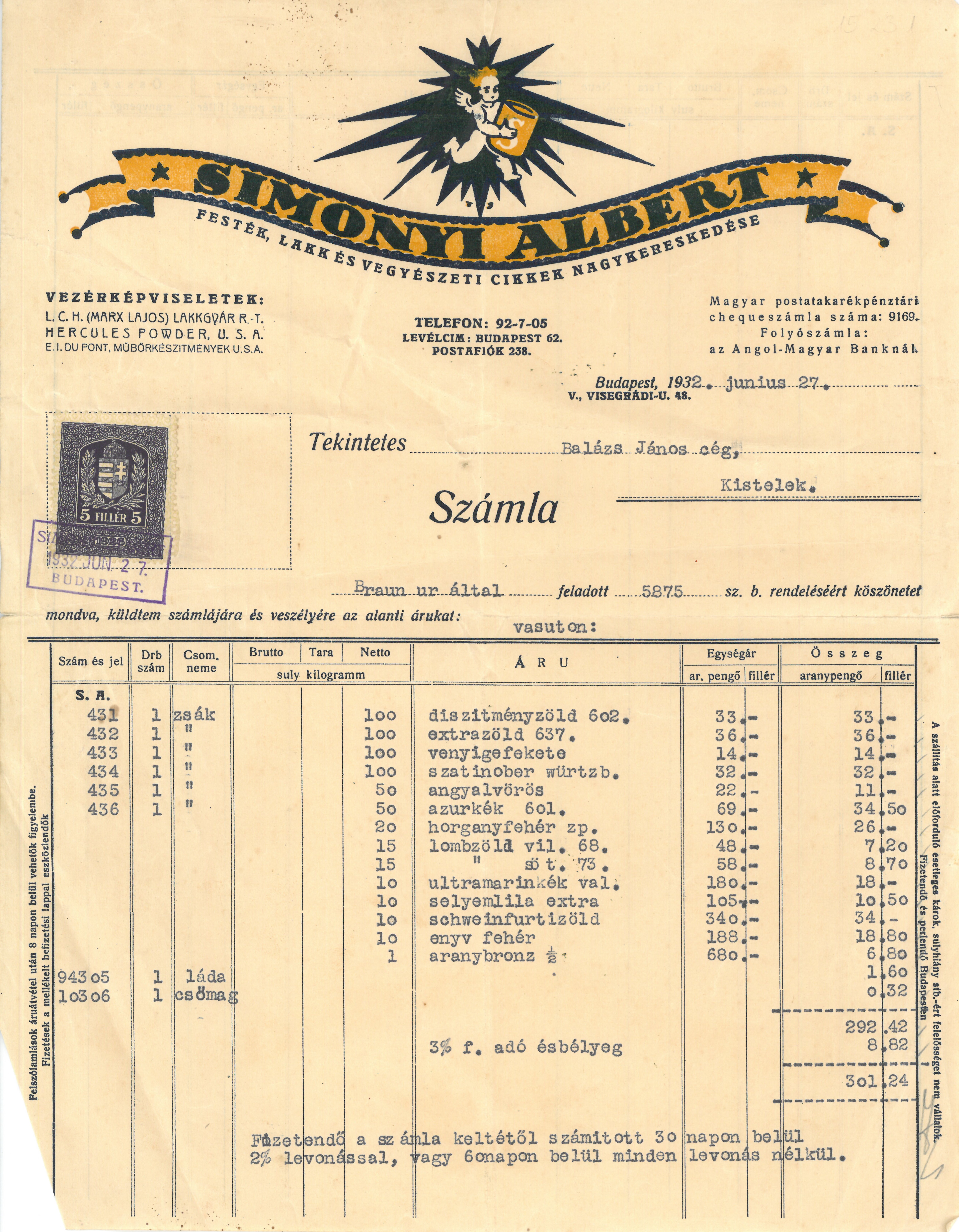 Számla Simonyi Albert festék-, lakk- és vegyészeti cikkek nagykereskedésétől.