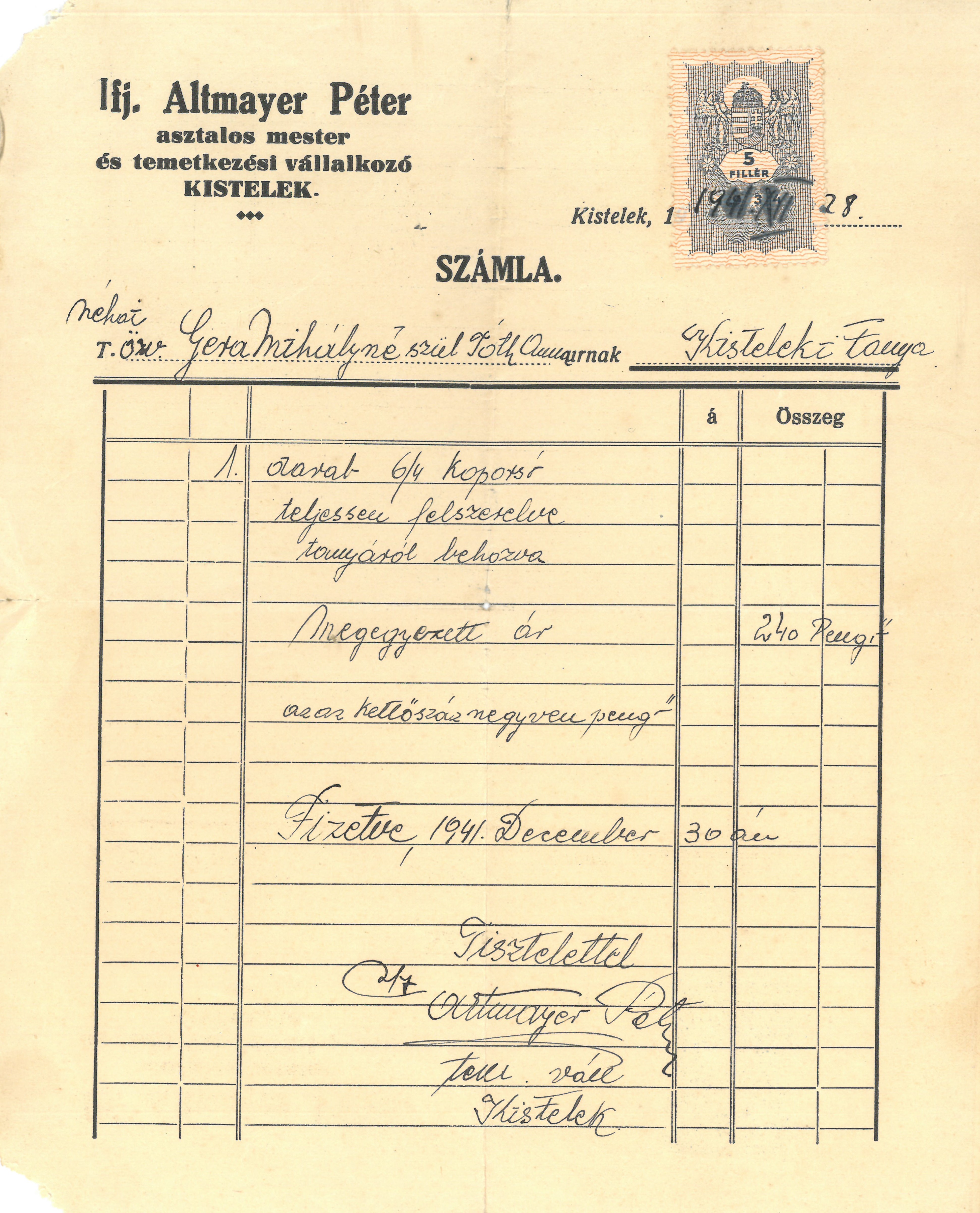 Ifj. Altmayer Péter asztalos mester és temetkezési vállalkozó által kiállított számla.
