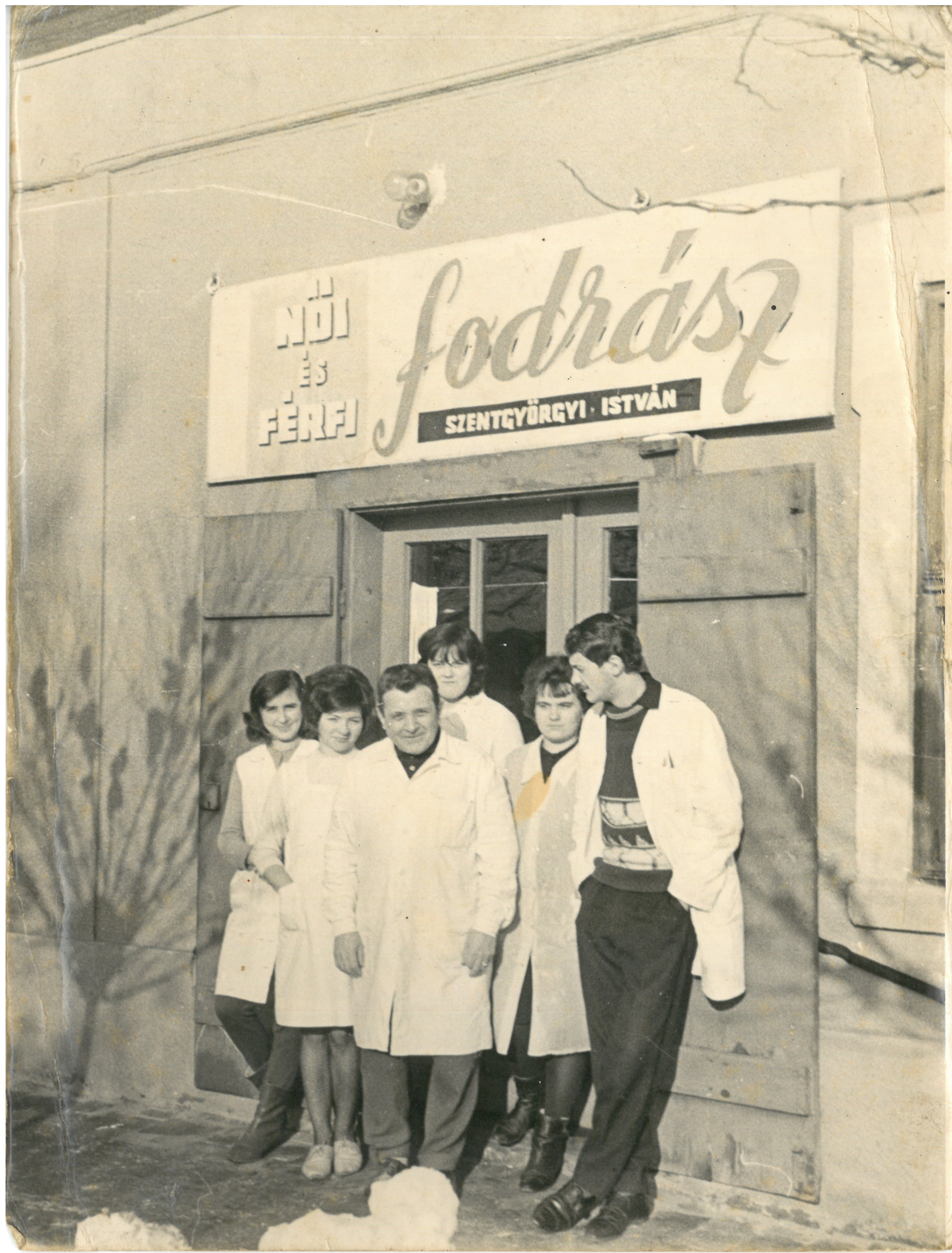 Szentgyörgyi István és munkatársai a fodrászüzlet előtt.