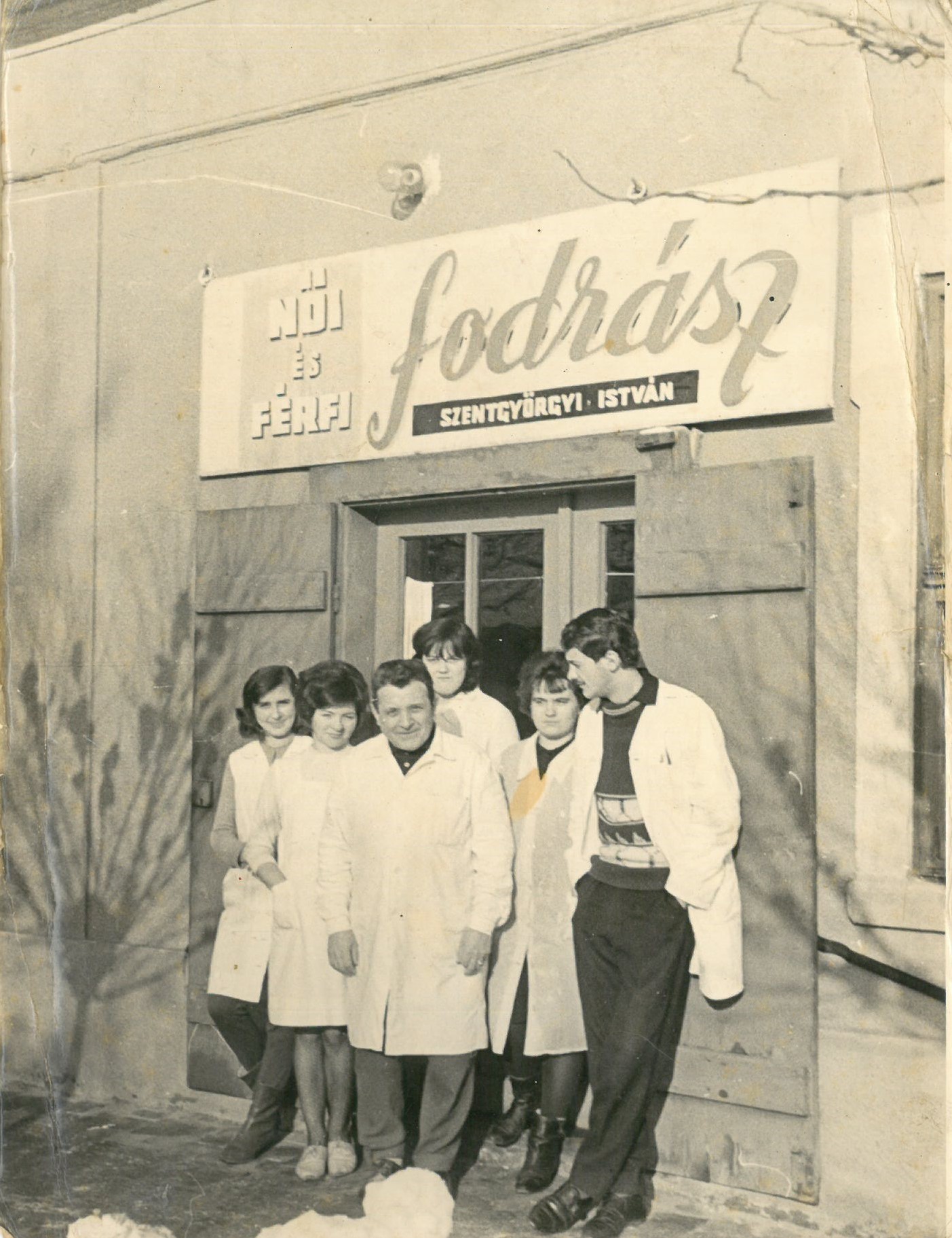 Szentgyörgyi István női és férfi fodrász munkatársaival. Az üzlet az 1960-as évek végén, 1970-es években működött Kistelek főutcáján, a jelenlegi Kossuth u. 6-8.sz. alatt található társasház helyén.