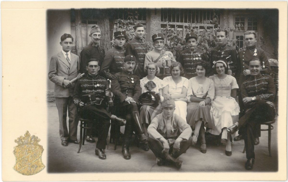 Színjátszó kör Kistelek. Férfiak zsinóros egyenruhában. Készült Dékány M. Tibor Kisteleki fotóműtermében. Hátoldala levelezőlap. Elején FOTO DÉKÁNY védjegy.