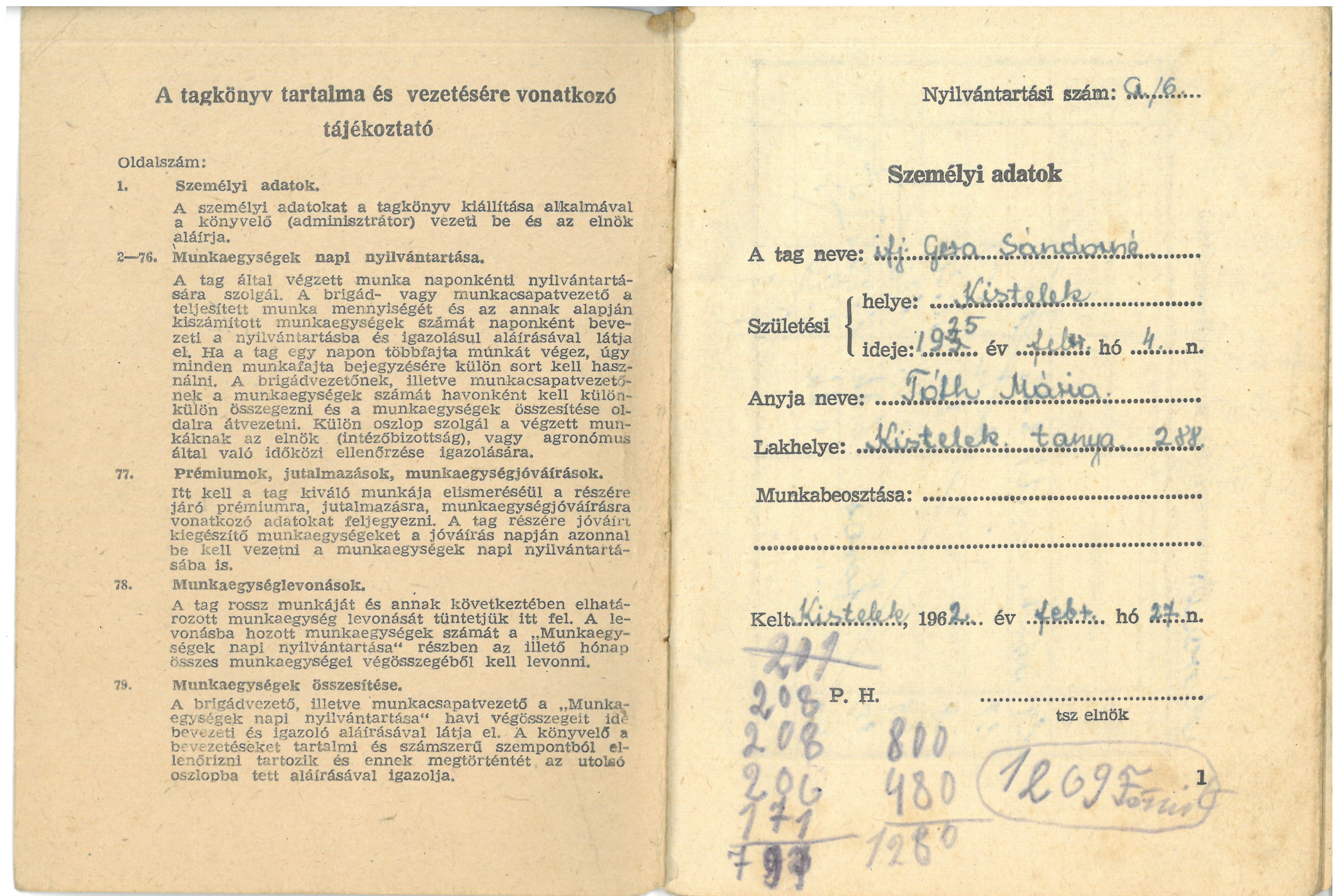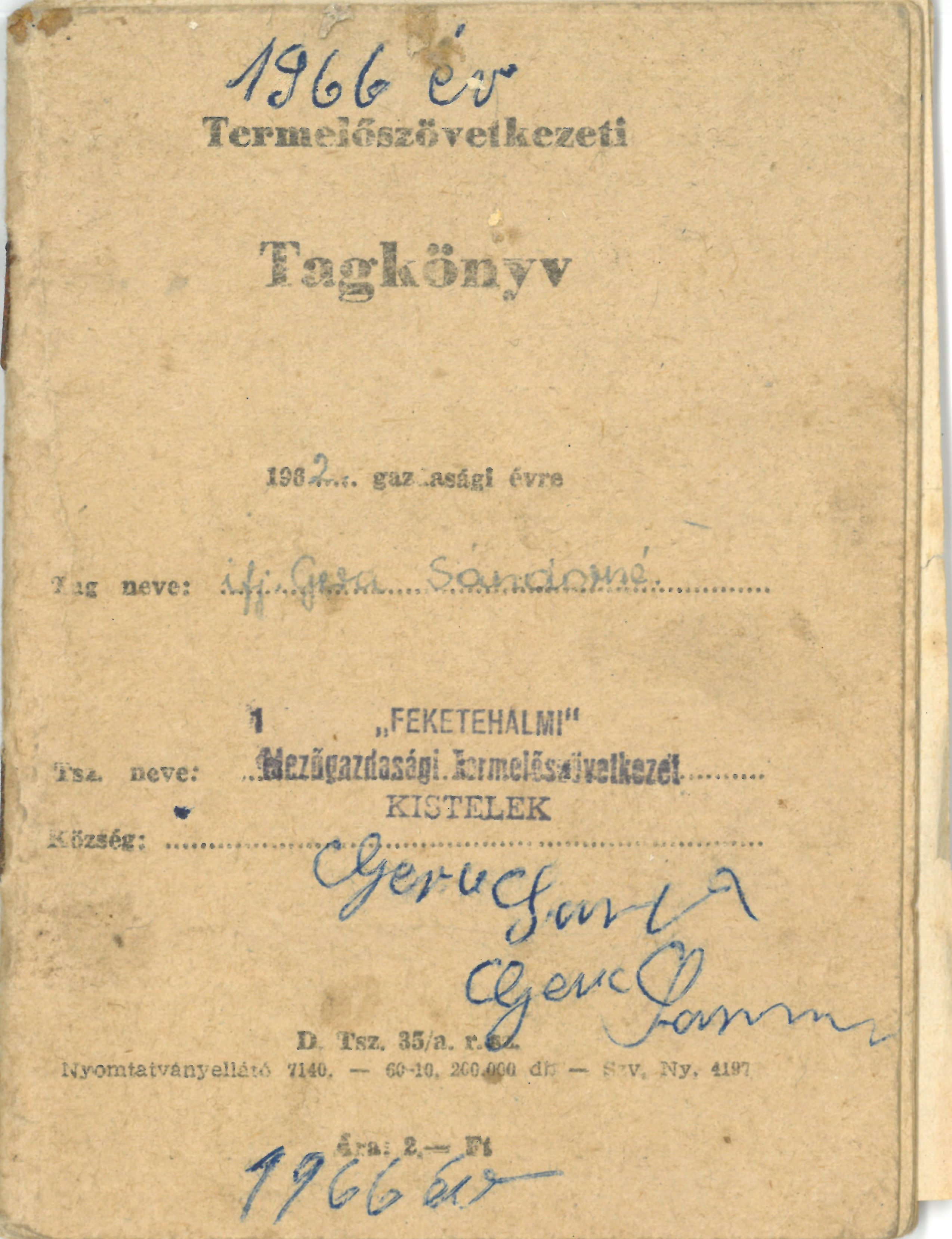 ifj. Gera Sándorné , Kistelek Tanya 288. nevére kiállított termelőszövetkezeti tagsági könyv 1962. február 27. keltezéssel