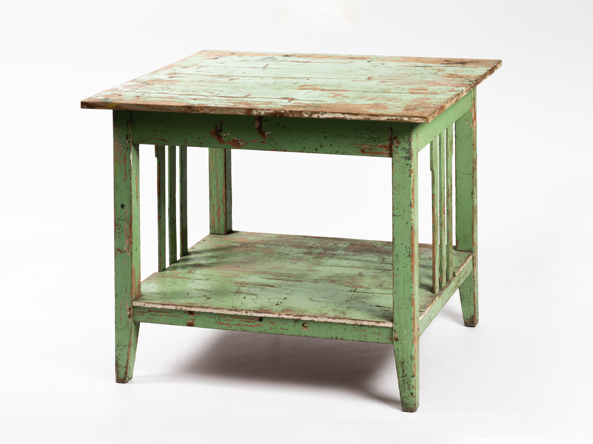 Négy lábú konyhaasztal, alul polcos, két rövidebb végén fapálcás merevítéssel, zöldre festett.