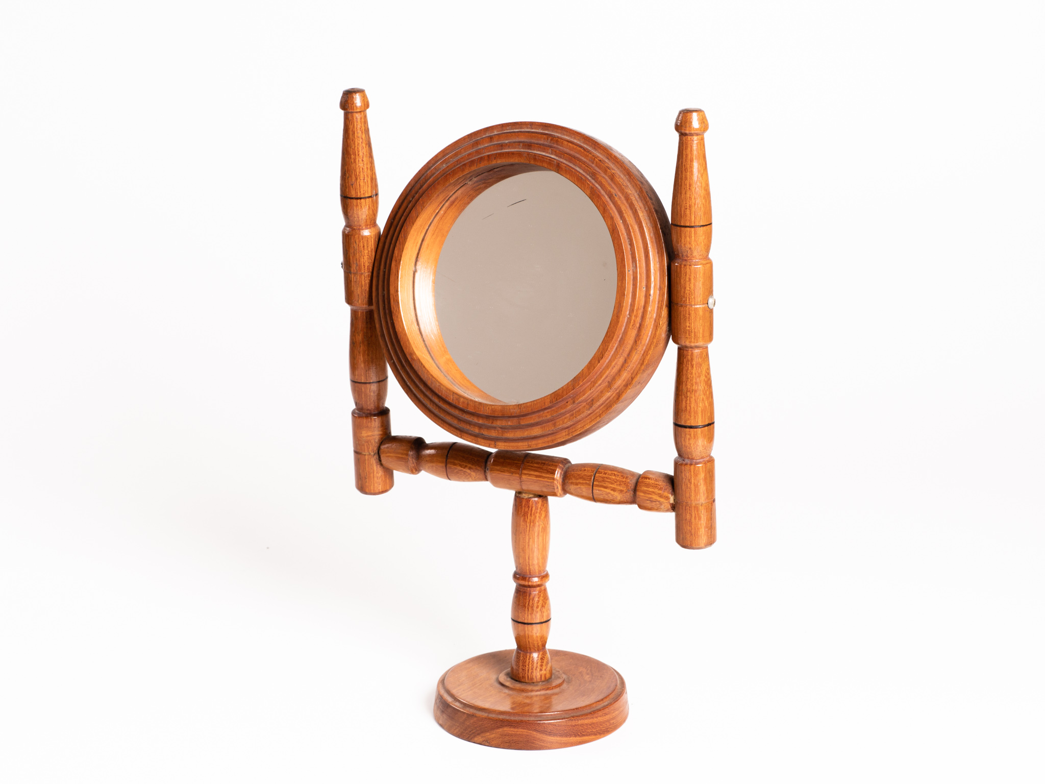 | Anyag és technika | esztergált fa talp és keret, tükörrel, lakkozott |