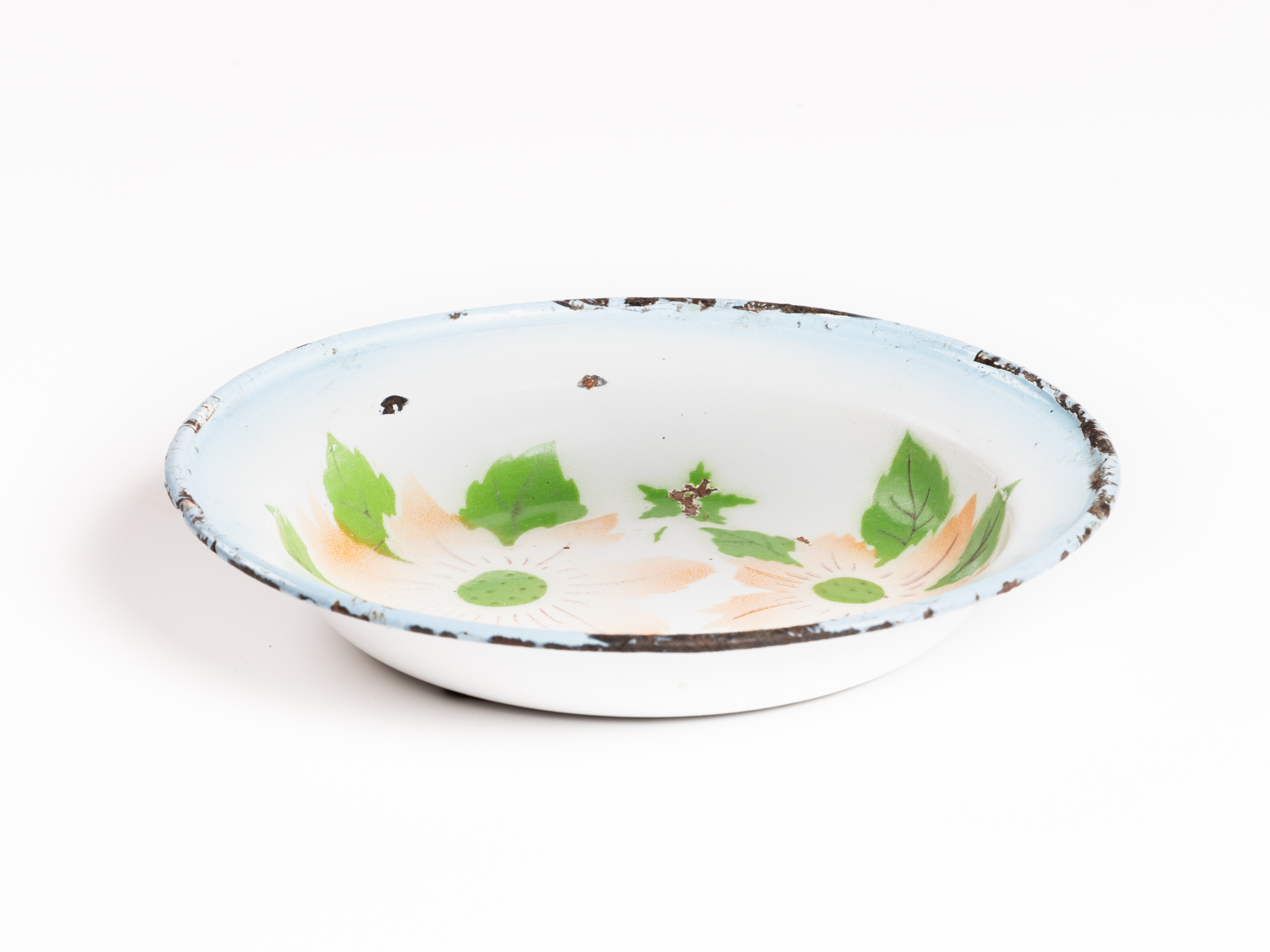 Zománcozott, világoskék peremű, virágmintás bádog mélytányér. A Bonyhádi Zománcárugyár terméke, mely 1958-tól a Lampart Zománcipari művek része lett.Védjegy: Bonyhád MSZ. A gyári termékek terjedésével részlegesen felváltotta a fajansz tányért a hétköznapi használatban.