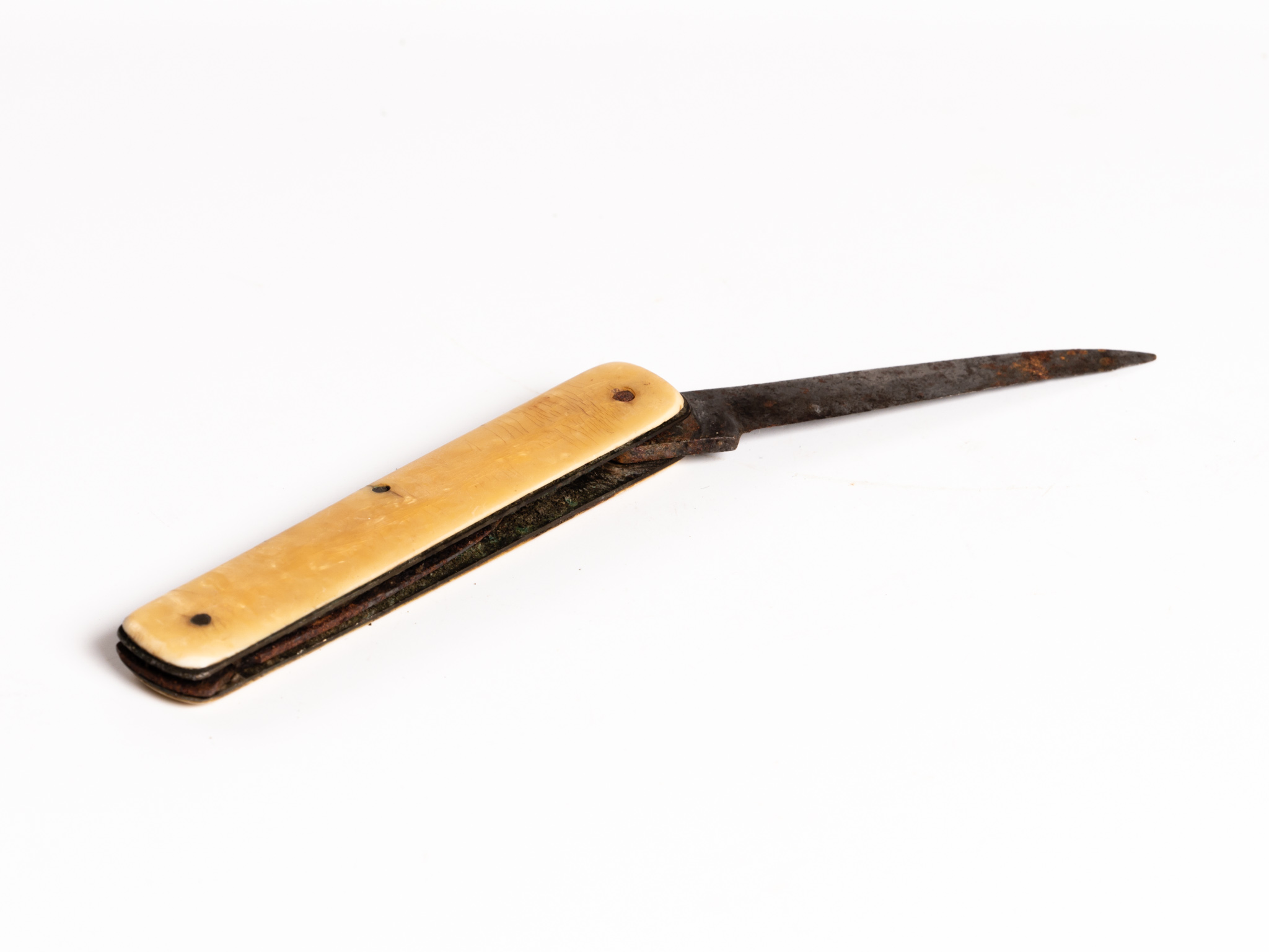 Könnyű, keskeny, celluloid, sárgás színezetű nyél, nyitható acélpengével,ami a használat során keskenyre és hegyesre kopott. Valószínűleg "szalonnázó bicska" lehetett. A bicska férfiaknál mindennapi használati eszköz volt, amit maguknál hordtak.