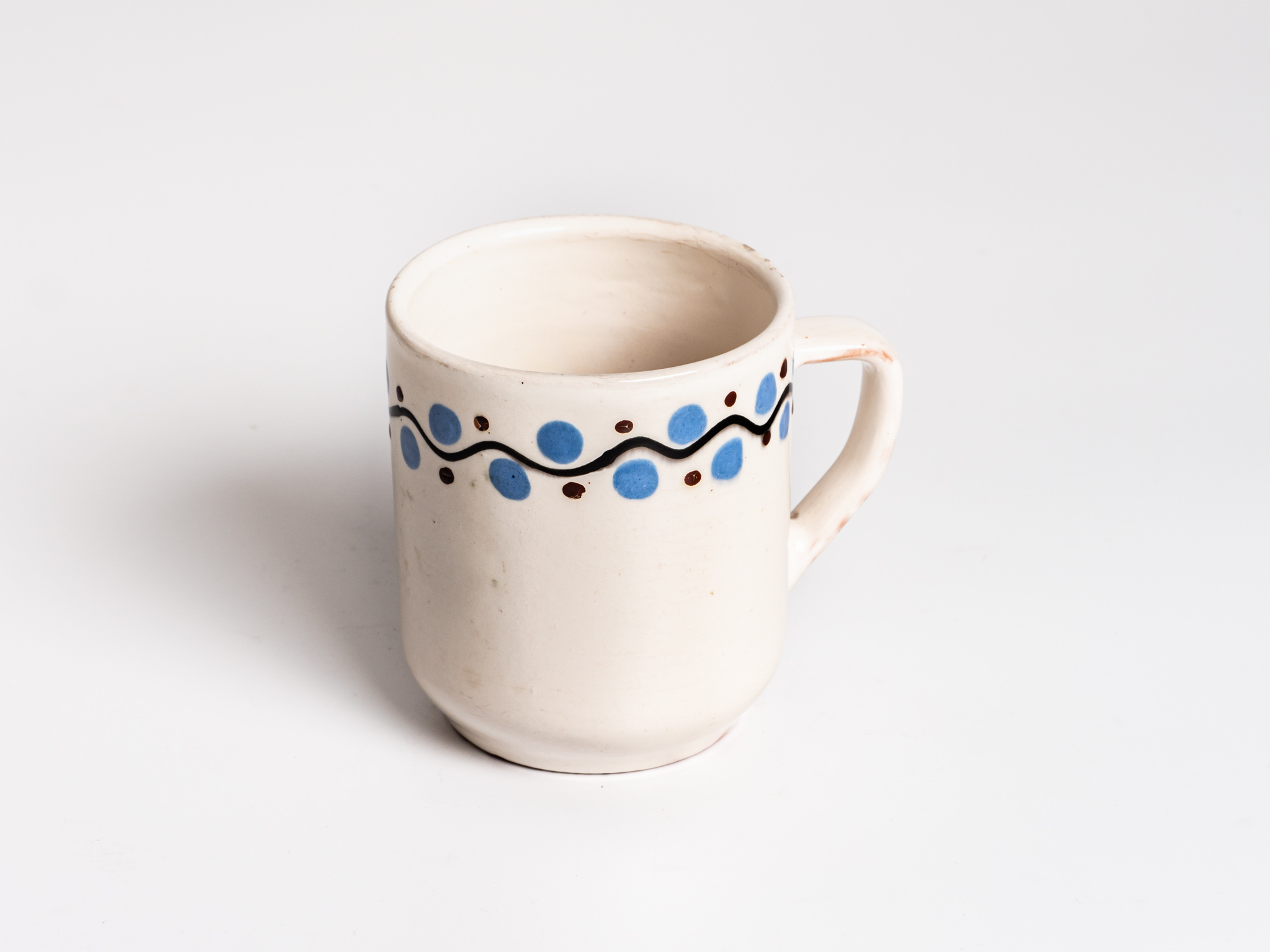 Fehér fajanszbögre, felső részén kék-pöttyös díszítéssel.