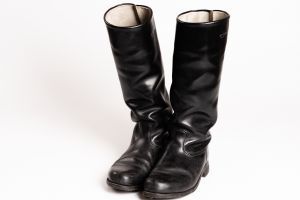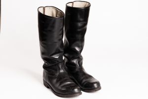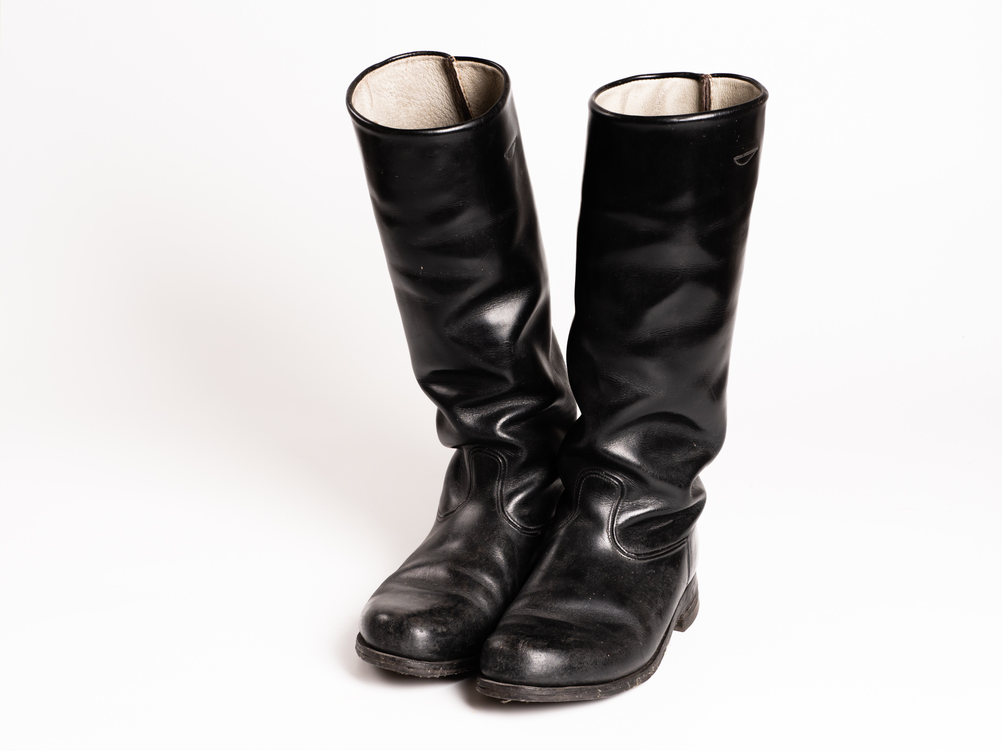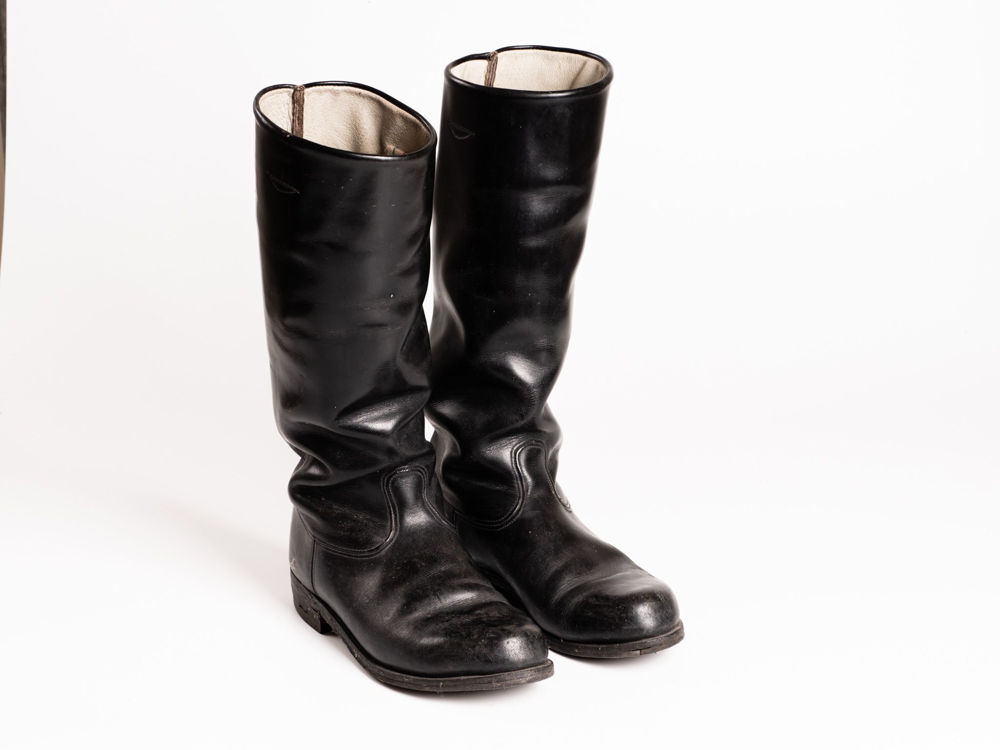 Fekete bőrből készült, hosszúszárú férfi bőrcsizma, bőr béléssel, belül rávarrott felhúzó-gurtnival. "42/163 G" felirattal. Kistelek kézműiparában előkelő helyet foglaltak el a csizmadiák az 1920-30-as években. Több csizmadia is dolgozott a településen, pl.: Kónya Mihály, Kurth Antal Mihály, Kurth Péter, Pataki Szilveszter. A csizmadiák a környékbeli településeken vásárokon értékesítették áruikat. A paraszti csizmaviselet a II. világháborúig jellemző. Egy pár kemény szárú csizma az 1900-1930-as évek között 1-3 mázsa búzát ért. A csizmát nagy becsben tartották, talpát, sarkát javíttatták.