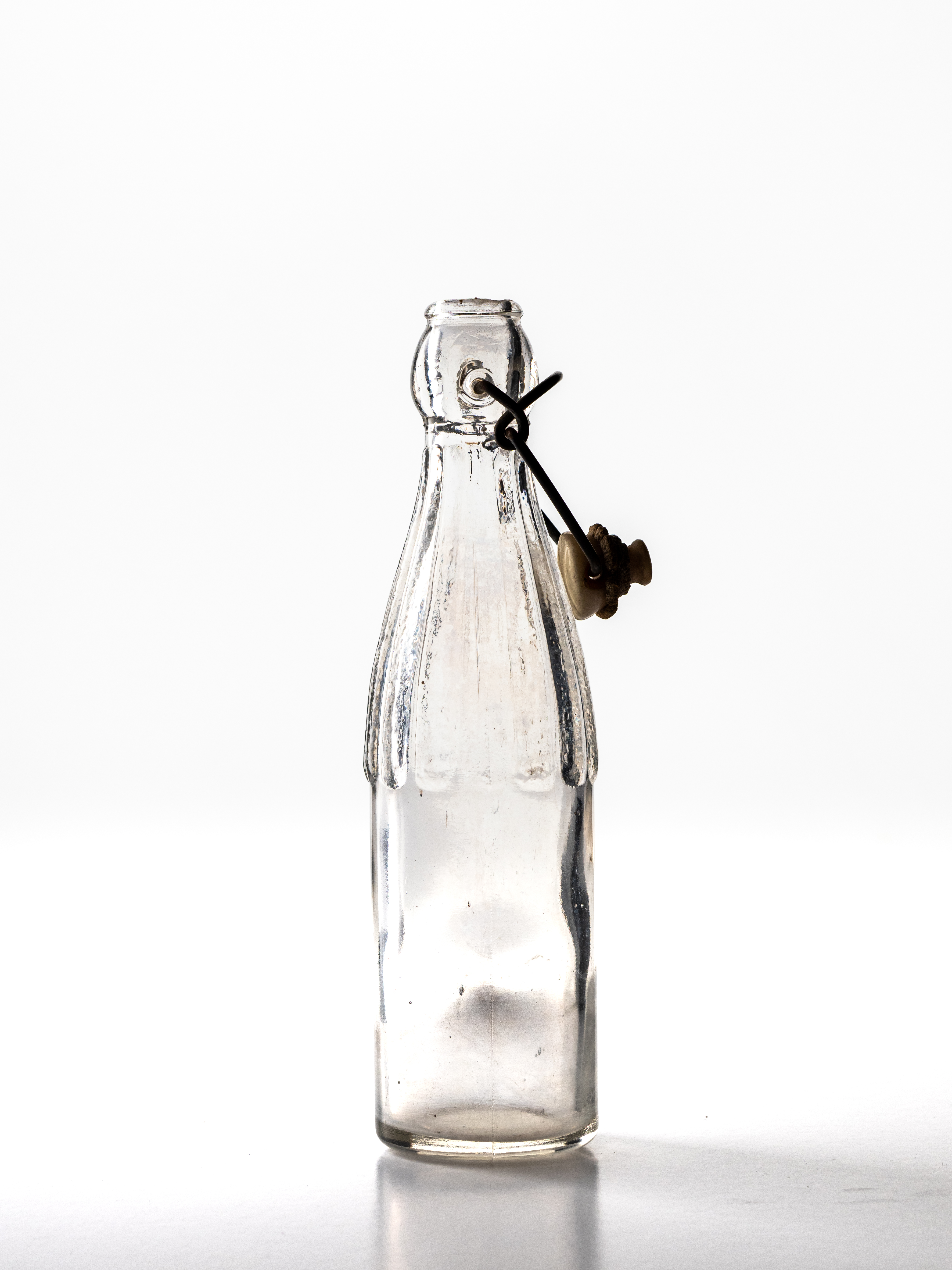 Átlátszó 0,25 literes üdítősüveg, kerámiacsatos kupakkal.