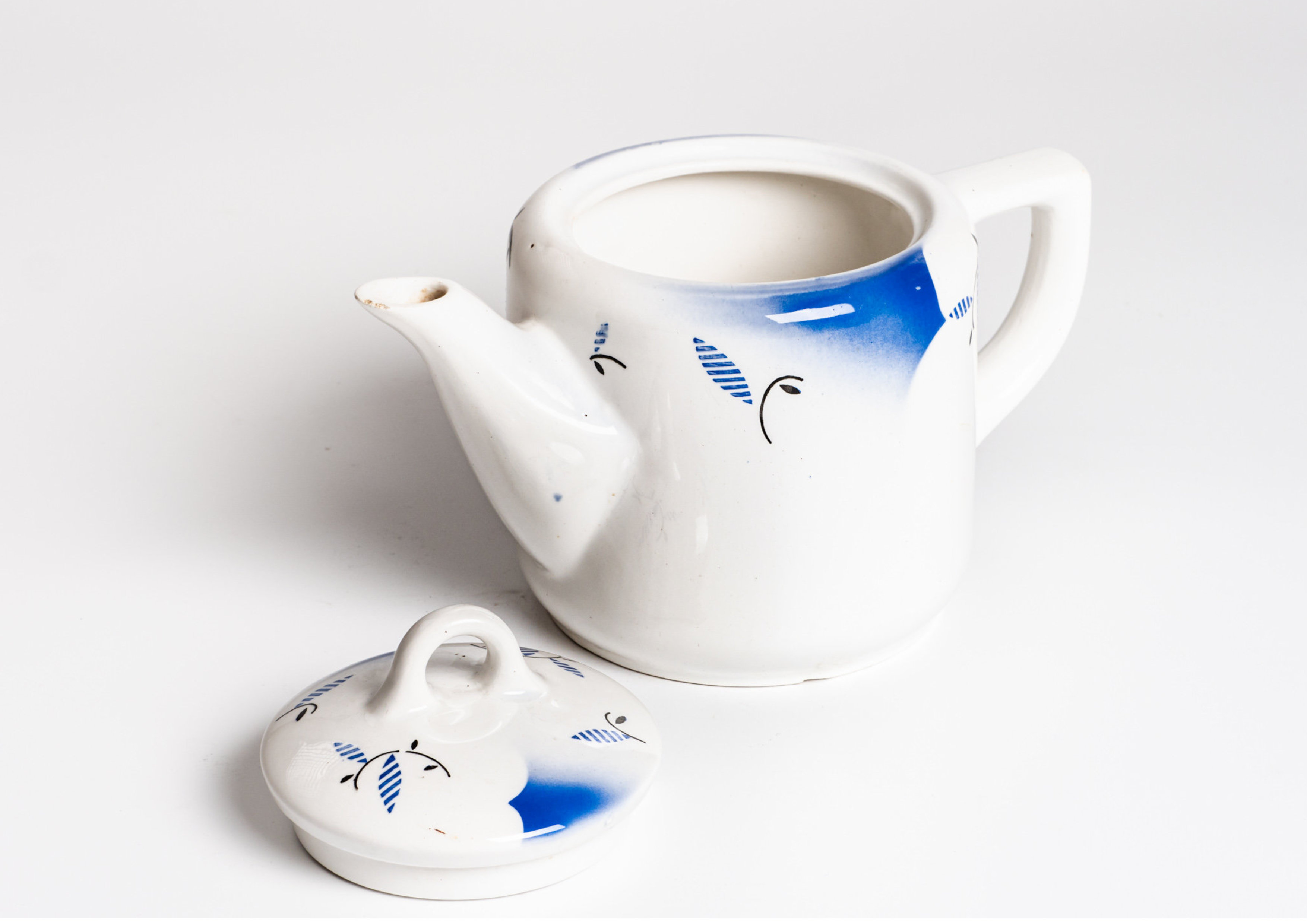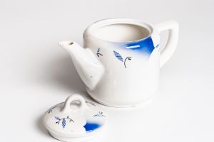 Fajanszból készült cukortartó, fehér alapon kék, virágindás díszítéssel, két füllel, fedővel. Készlet része, teáskiöntő is tartozik hozzá. Alján védjegy: GRANIT, két egymásba fordított háromszögben K,K,K,P 1456 jelzéssel. Az 1920-as évektől működő kispesti Gránitgyár terméke.