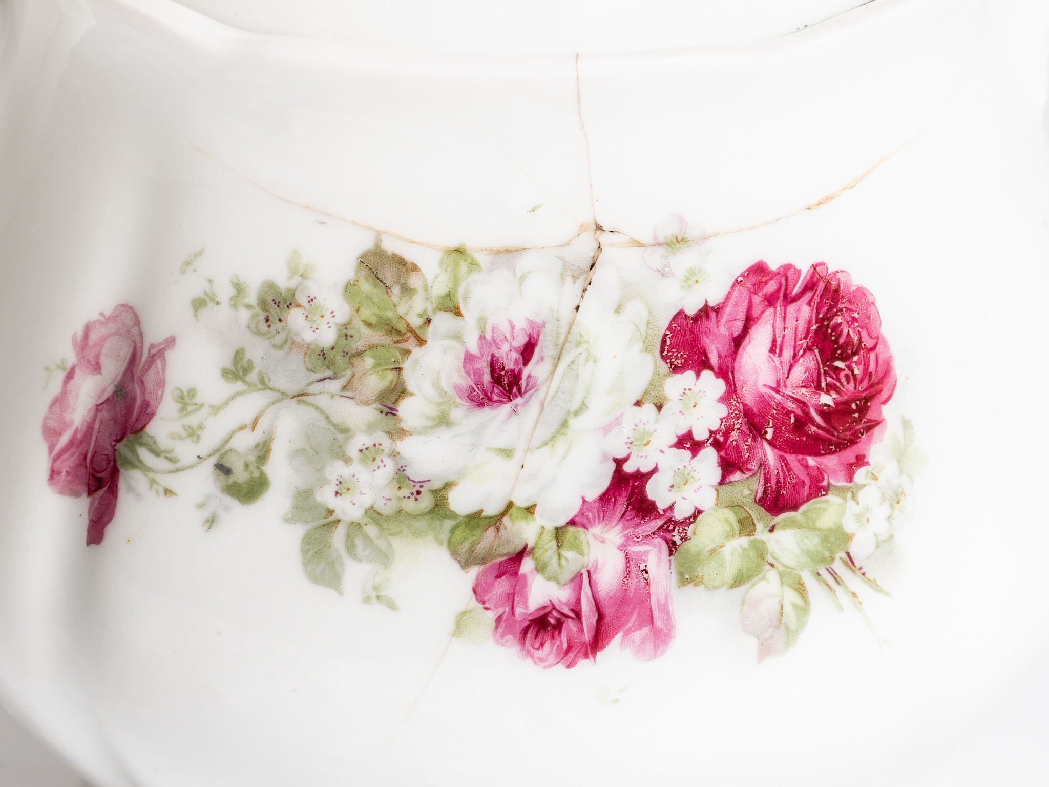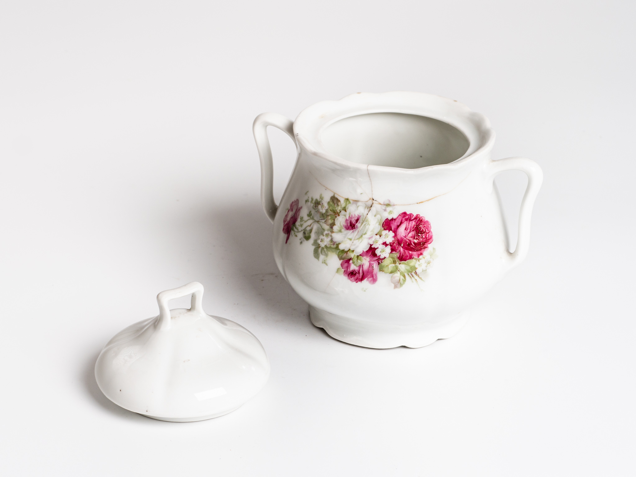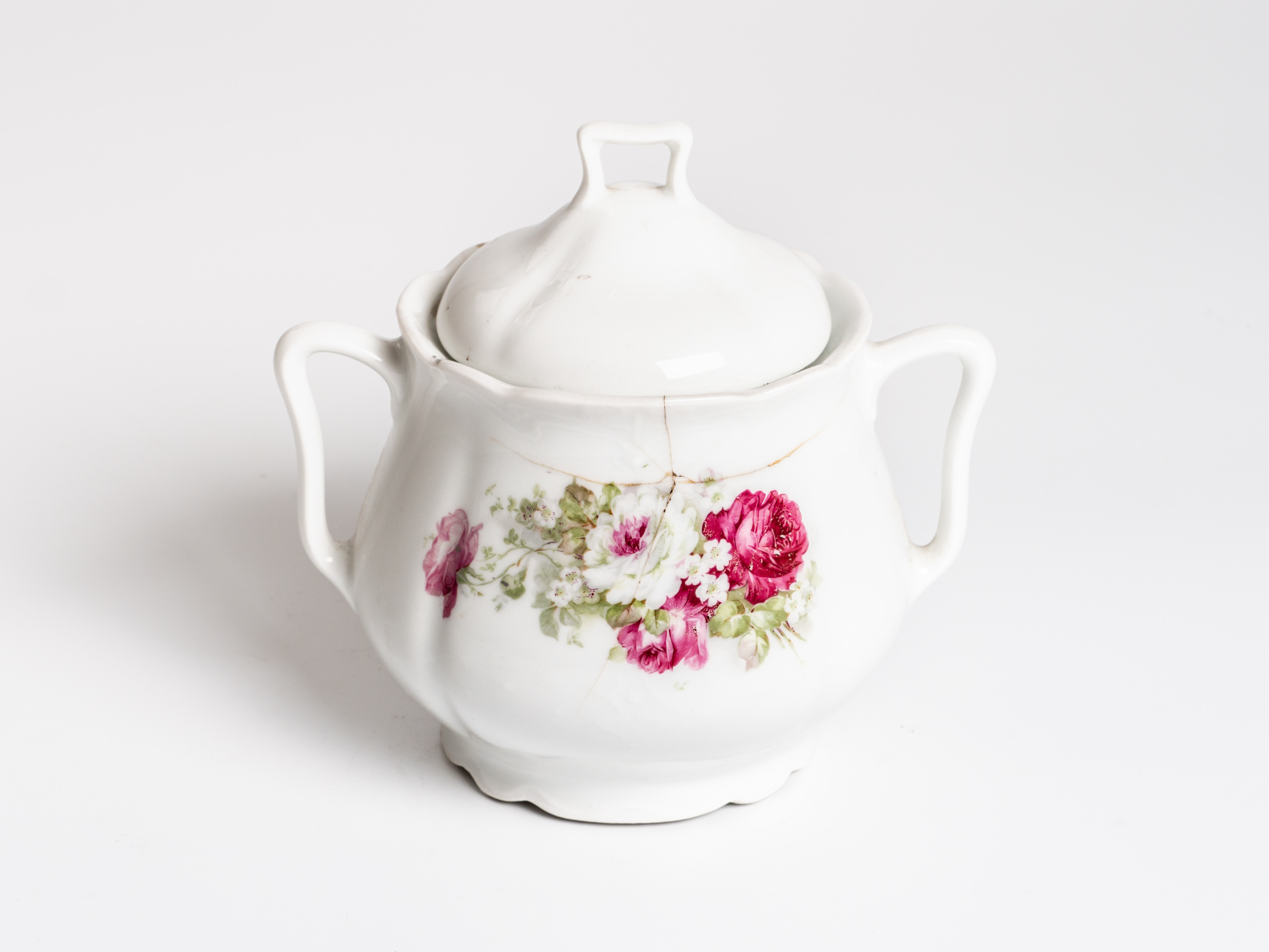 Porcelán, rózsaszínű rózsamotívummal díszített, kétfüles, hullámos peremű cukortartó fedéllel. Védjegy nélkül.