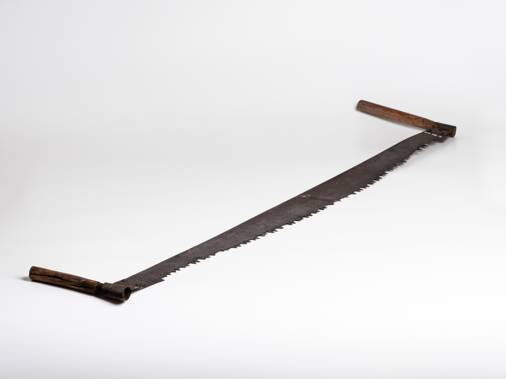 fém fűrészlap, egyenes fogazattal, végein 2 fa fogantyúval
