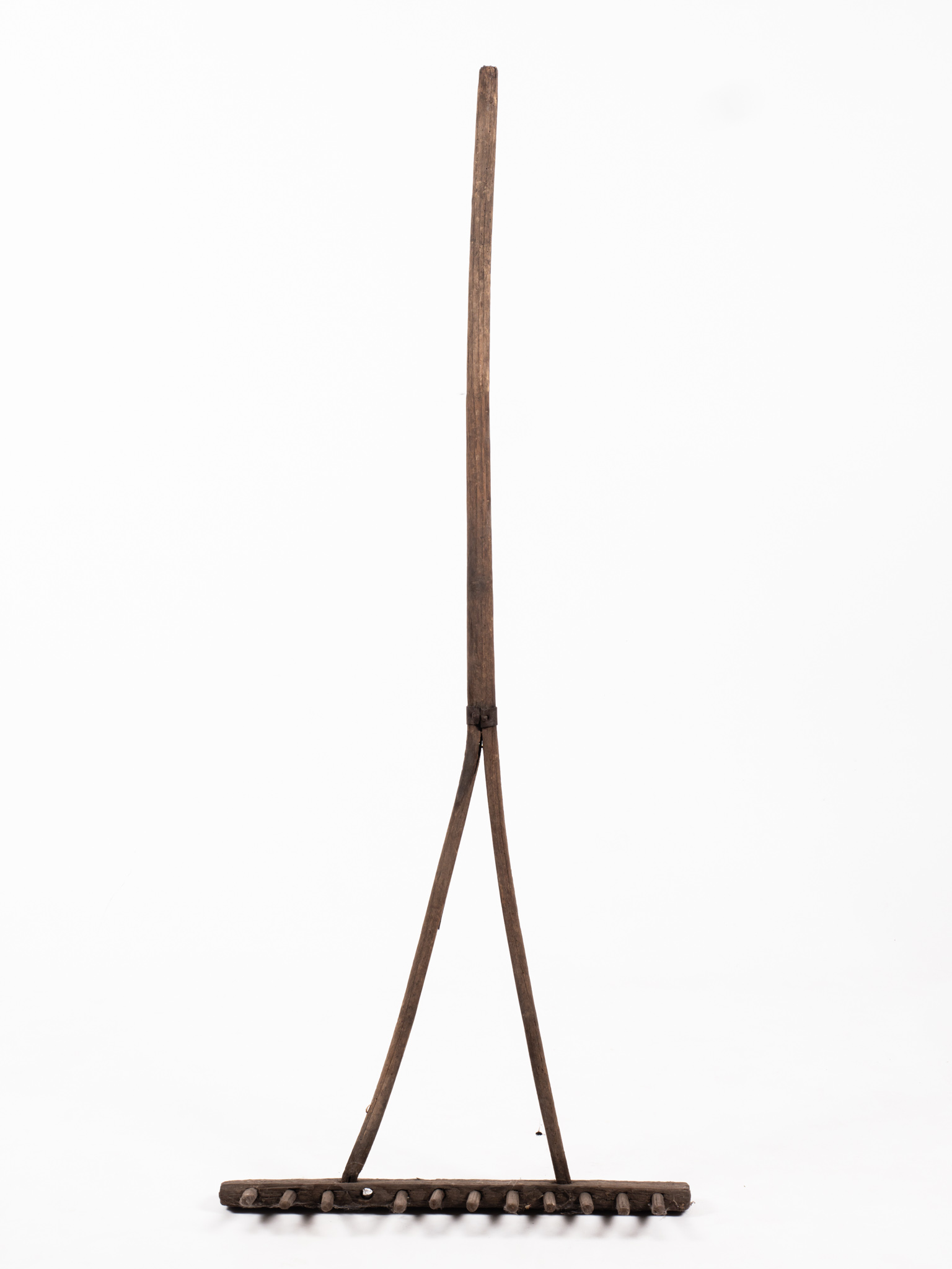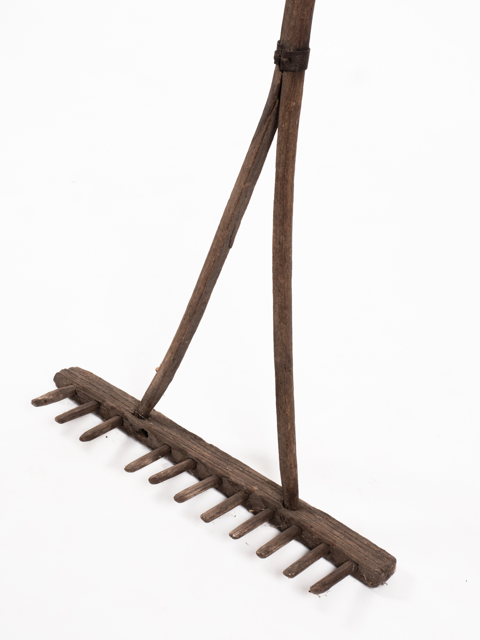 Kisméretű mezei szénagereblye hasított nyéllel, 12 fogú. Javított, a nyél hasítéknál vasalással megerősítve. A fagereblyéket paraszti specialisták készítették. Sok faeszköz az Alföld peremterületén lévő fafaragó központokból került az Alföldre. Pl. Mátraalmás