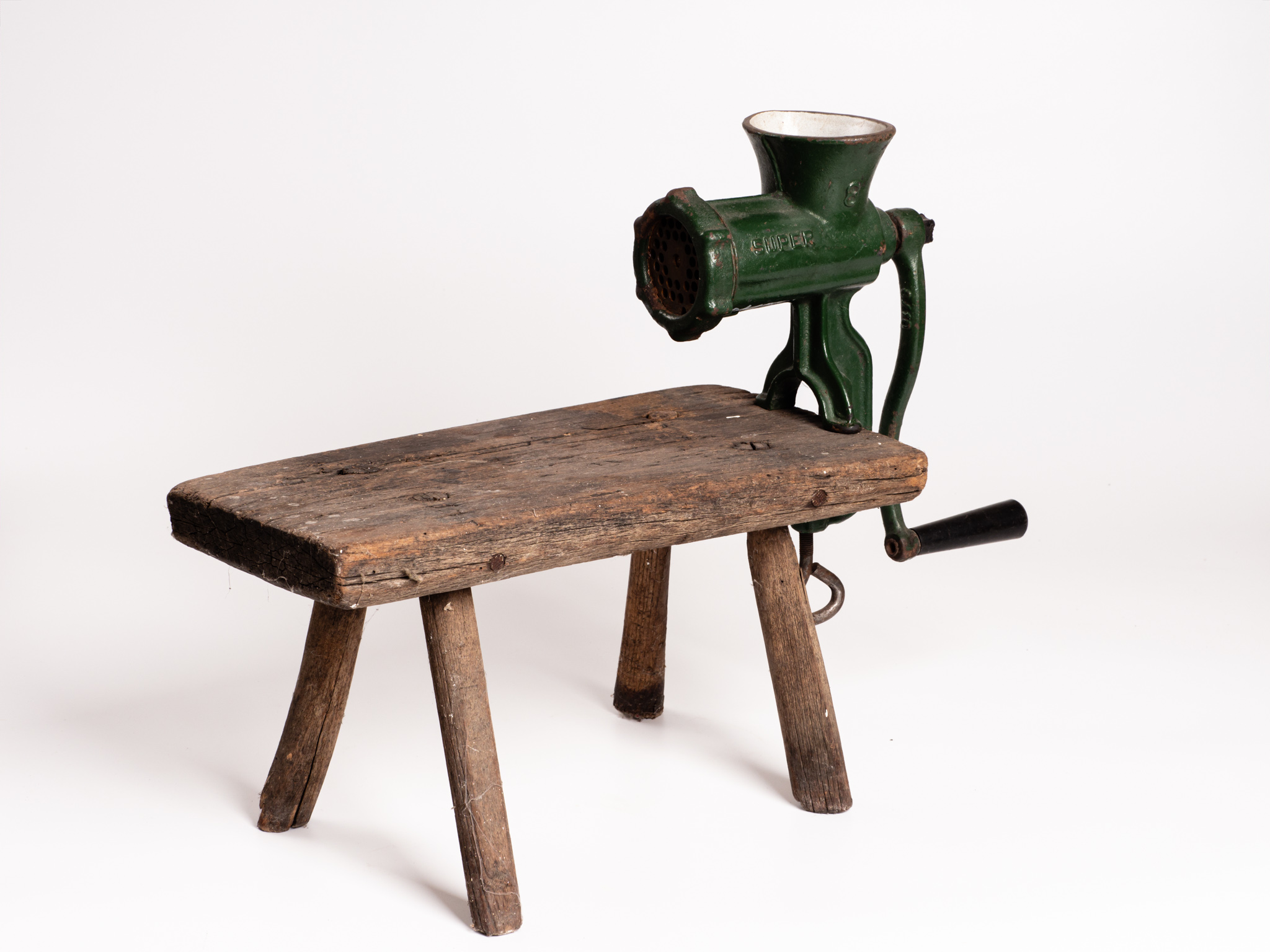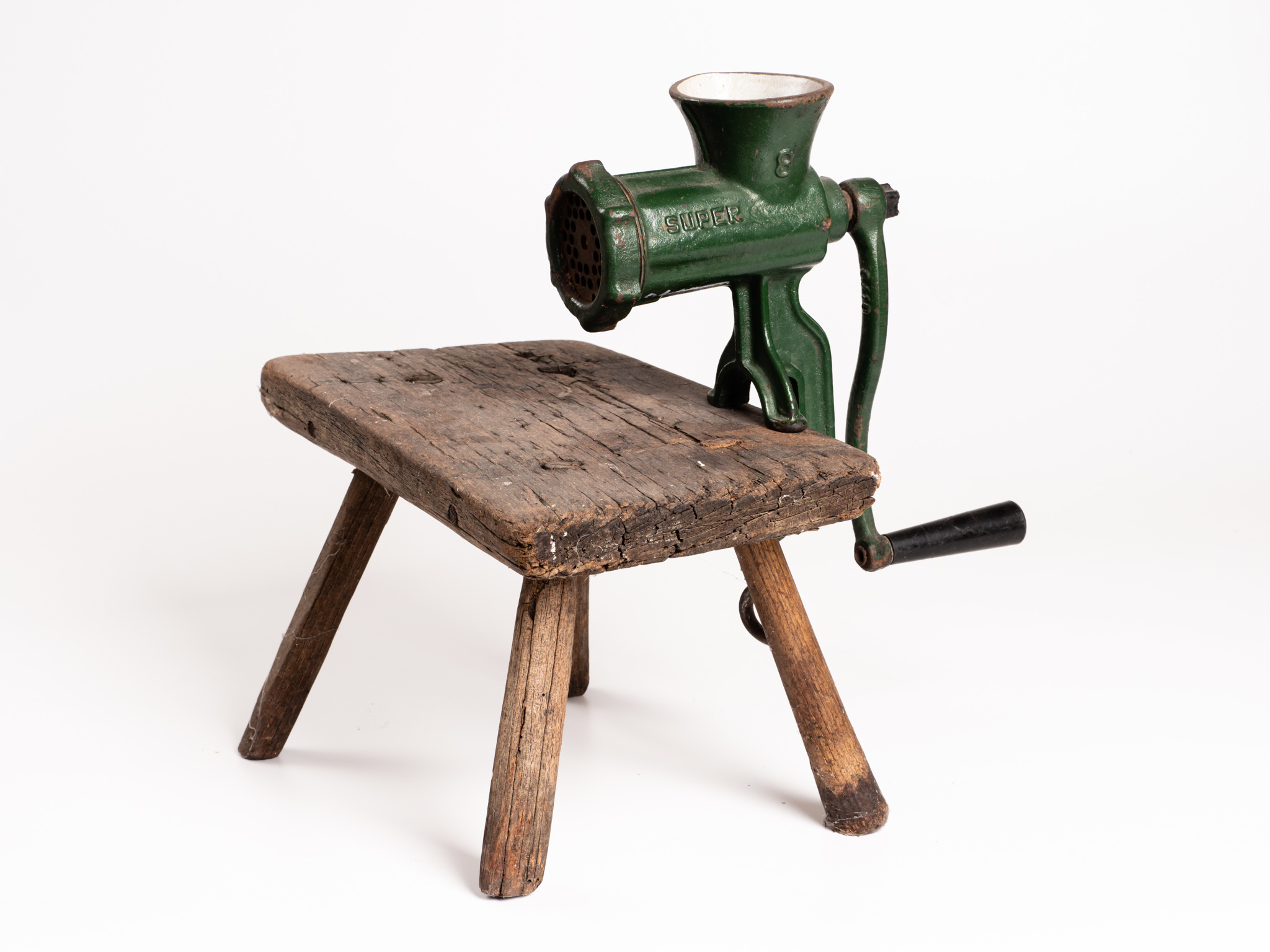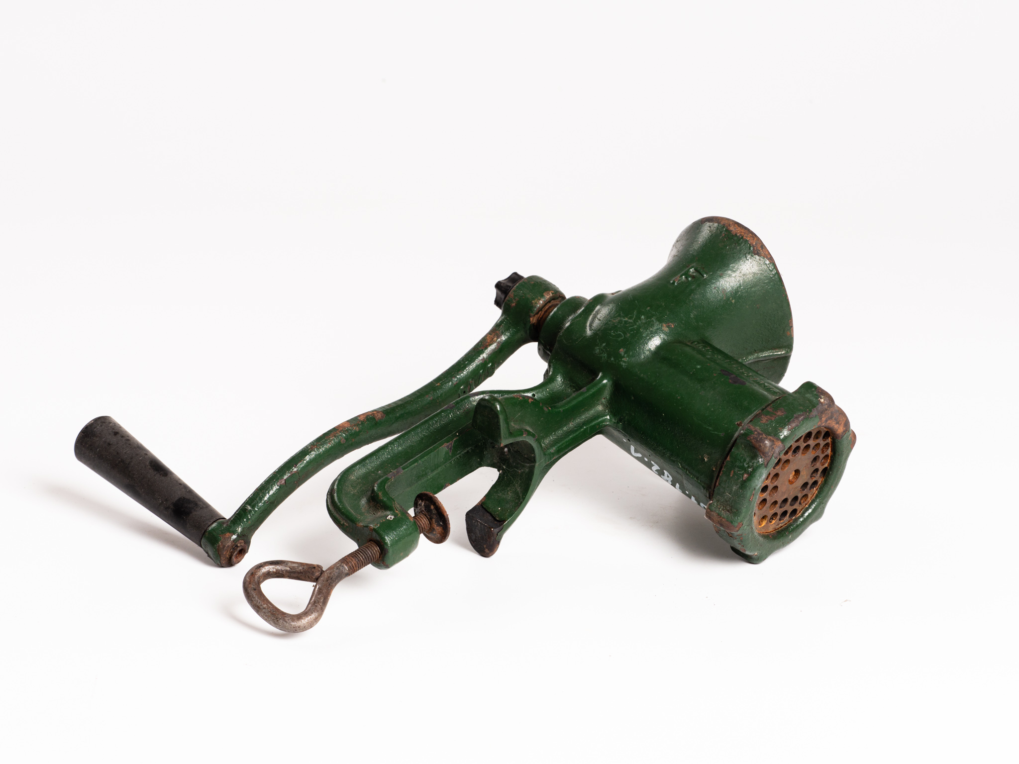 Öntvényből készült húsdarálásra használt gyári előállítású daráló, a paraszti háztartásban a disznóvágás nélkülözhetetlen eszköze.