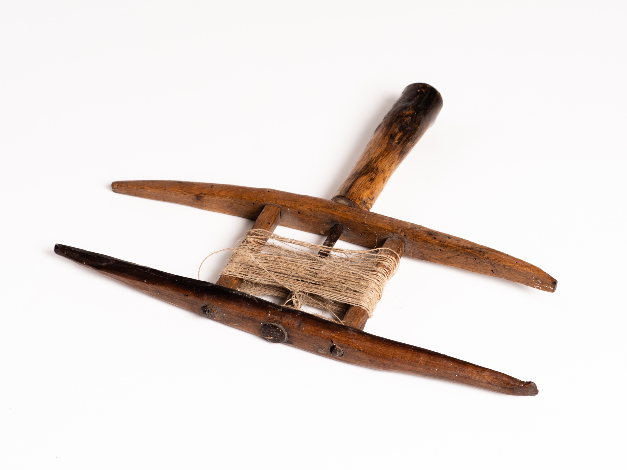 Fából, fém alkatrésszel készült,nyeles, forgatható kéziszerszám, amit kender fonására, több szál összesodrására használtak. Az egyik darab teljesen fából készült, a másik darab függőleges középső tengelye fémből van.