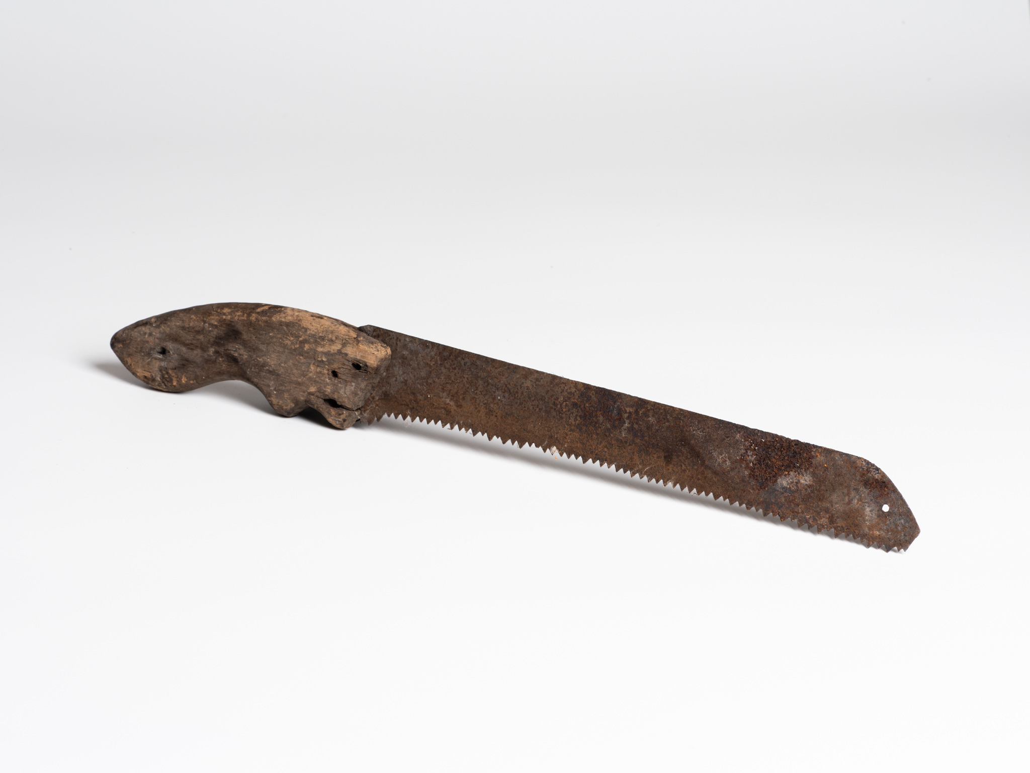 | Anyag és technika | fém fűrészlap fa nyéllel, szegecselt |