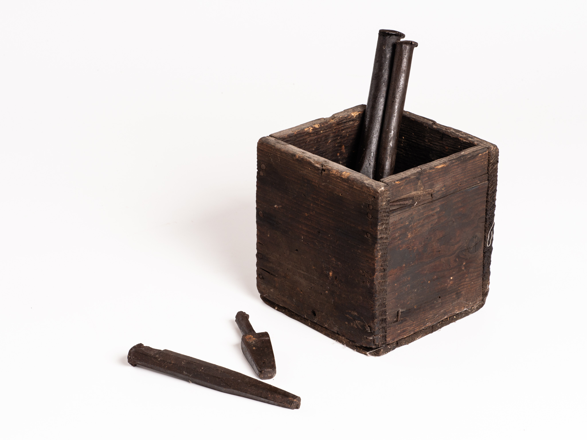 Vasból készült eszközök, kisebb fadobozban. A vágókat, lyukasztókat a kovácsdarabon levő anyagfölösleg eltávolítására, üregek kialakítására, hidegen vagy melegen végzett kézi darabolásra használták. Pigniczki Ferenc hagyatéka.