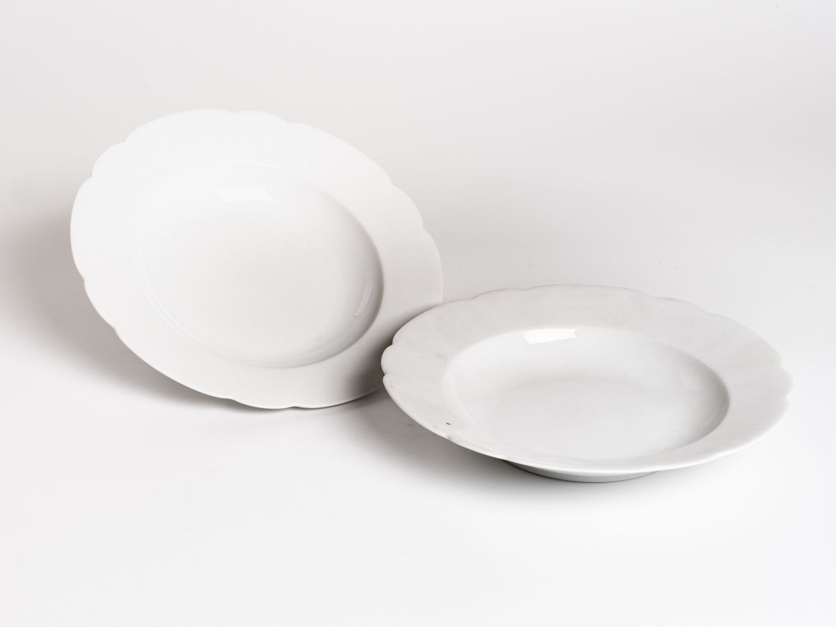 Hullámos szélű, fehér porcelán mélytányér. Bajor porcelángyár terméke. Védjegy: Inka die Qualität Seltmann Weiden & Bavaria, W. Germany. Paraszti háztartásban nem jellemző.