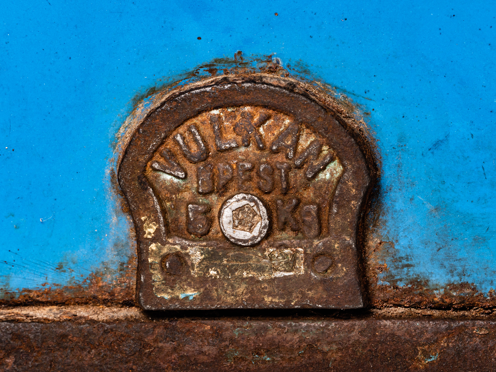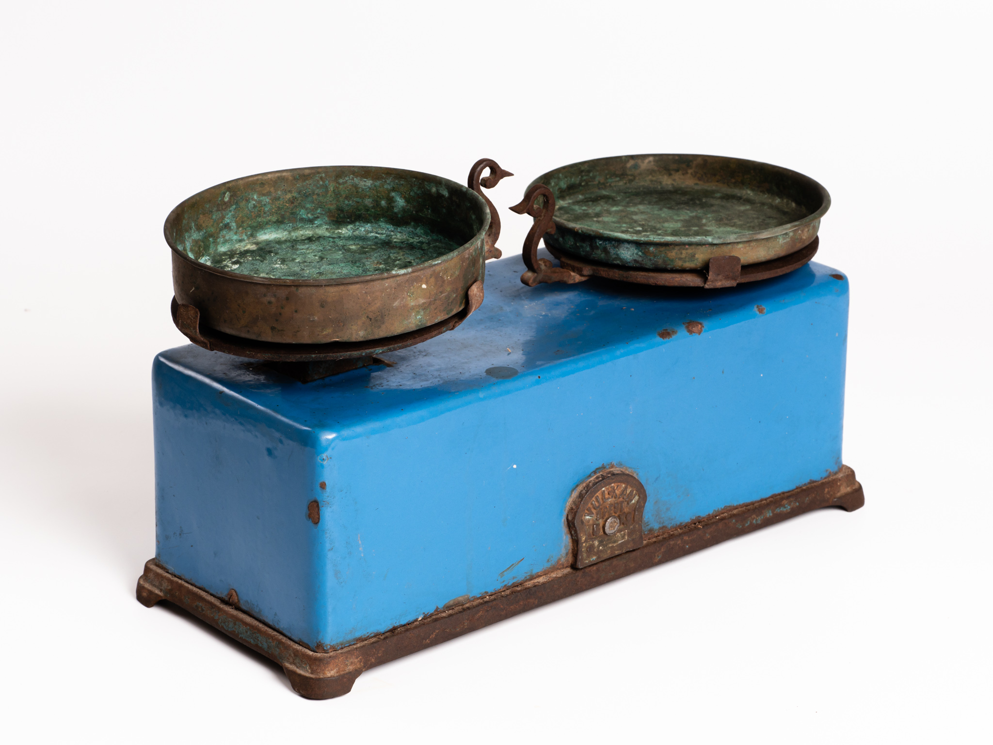 Asztali, piaci mérleg két rézserpenyővel, súlyok nélkül, sötétkék festéssel. Márkajelzés: VULKAN B.P 5 kg felirat.