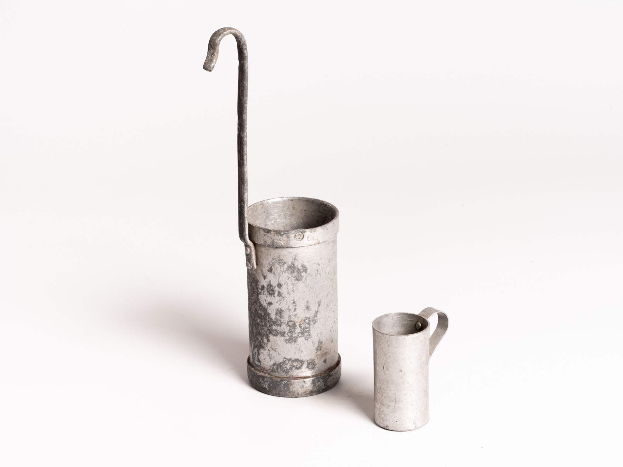 Alumíniumból készült füles mérőedények. 1 dl-es, és 0,5 literes méretben. Például tehéntartó gazdaságokban a tej kiméréséhez használták.
