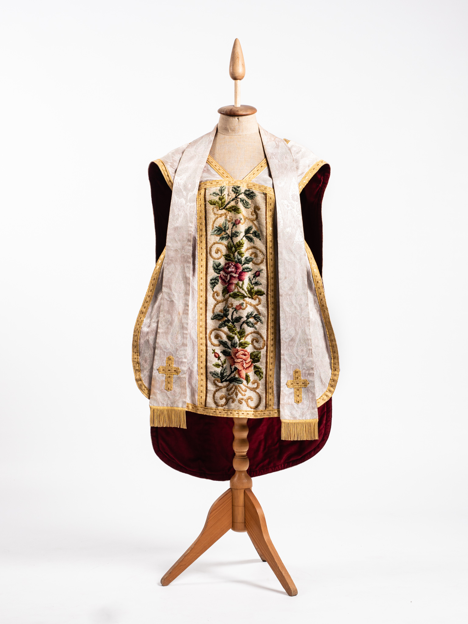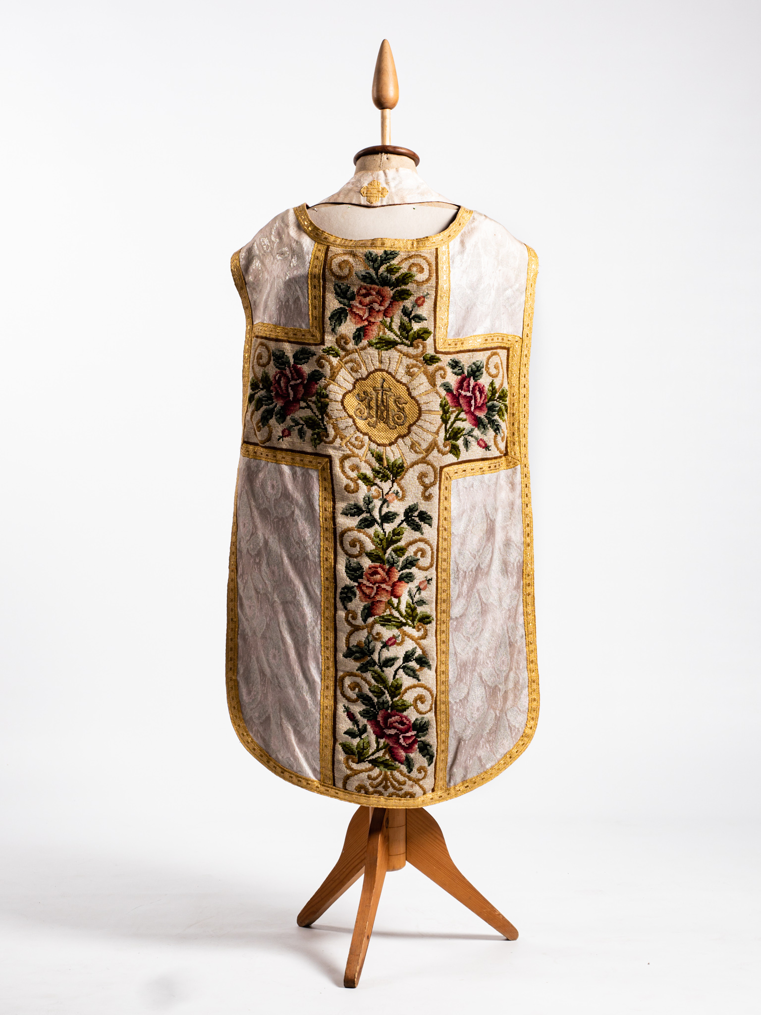 Fehér brokát miseruha, aranyszegéllyel, amit ünnepi misén a pap viselt. A ruha elején és hátulján kereszt alakzatban kannavászonra varrt rózsamotívumos gobelin díszítés található. A gobelinkereszt közepén IHS felirat. Bélése sötétbordó. A Kisteleki Plébánia kegytárgyai közül való.Ugyanabból az anyagból készült két végén sárga selyemrojtos stóla tartozik hozzá.