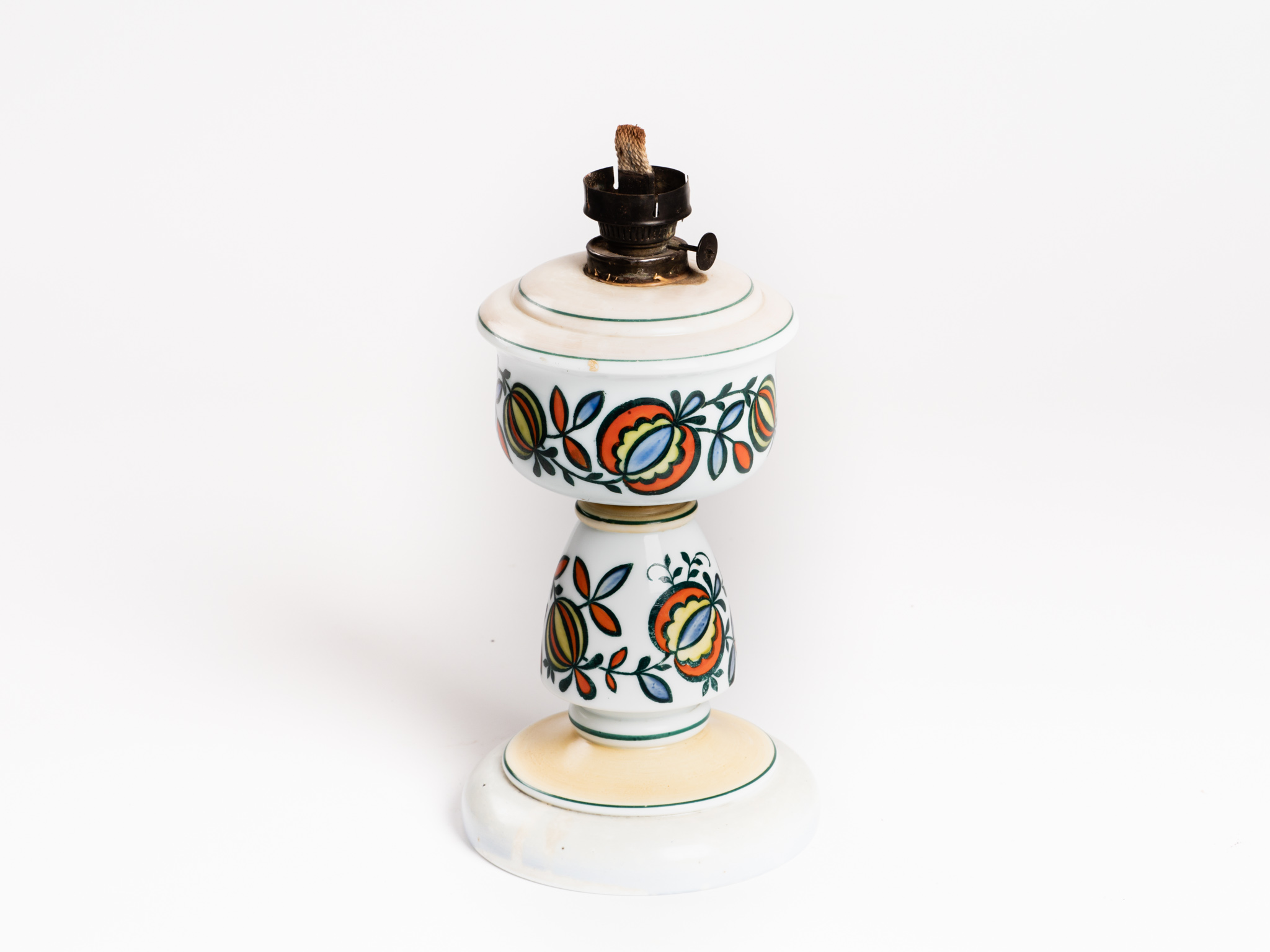 Védjegy nélküli, fehér porcelán talprésszel rendelkező, festett gránátalmás motívumokkal díszített asztali petróleumlámpa üveg nélkül. A paraszti háztartásokban a 19. század végétől terjed el, a villanyáram bevezetéséig a parasztházak világítóeszköze. A Kistelek környéki tanyákon még az 1960-70-es években is használták. A petróleumot a lámpa alsó részébe töltötték. A lámpa fényét a lámpabél magasságával szabályozták. A petróleumlámpa gyári tömegtermék volt.