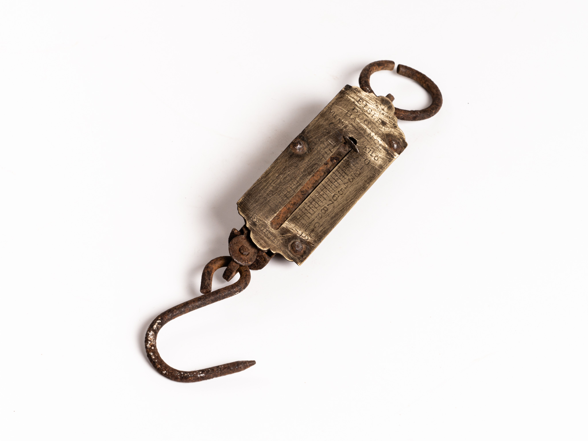 Kézi rugós súlymérő eszköz rézből. Ún. halmérleg. Márkajel: EISLER POCKET BALANCE