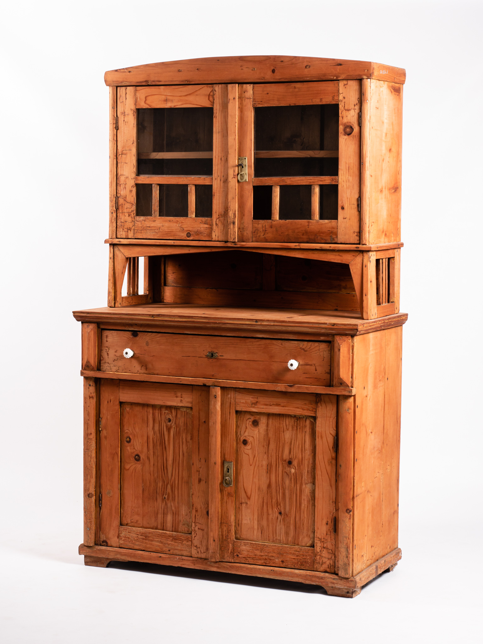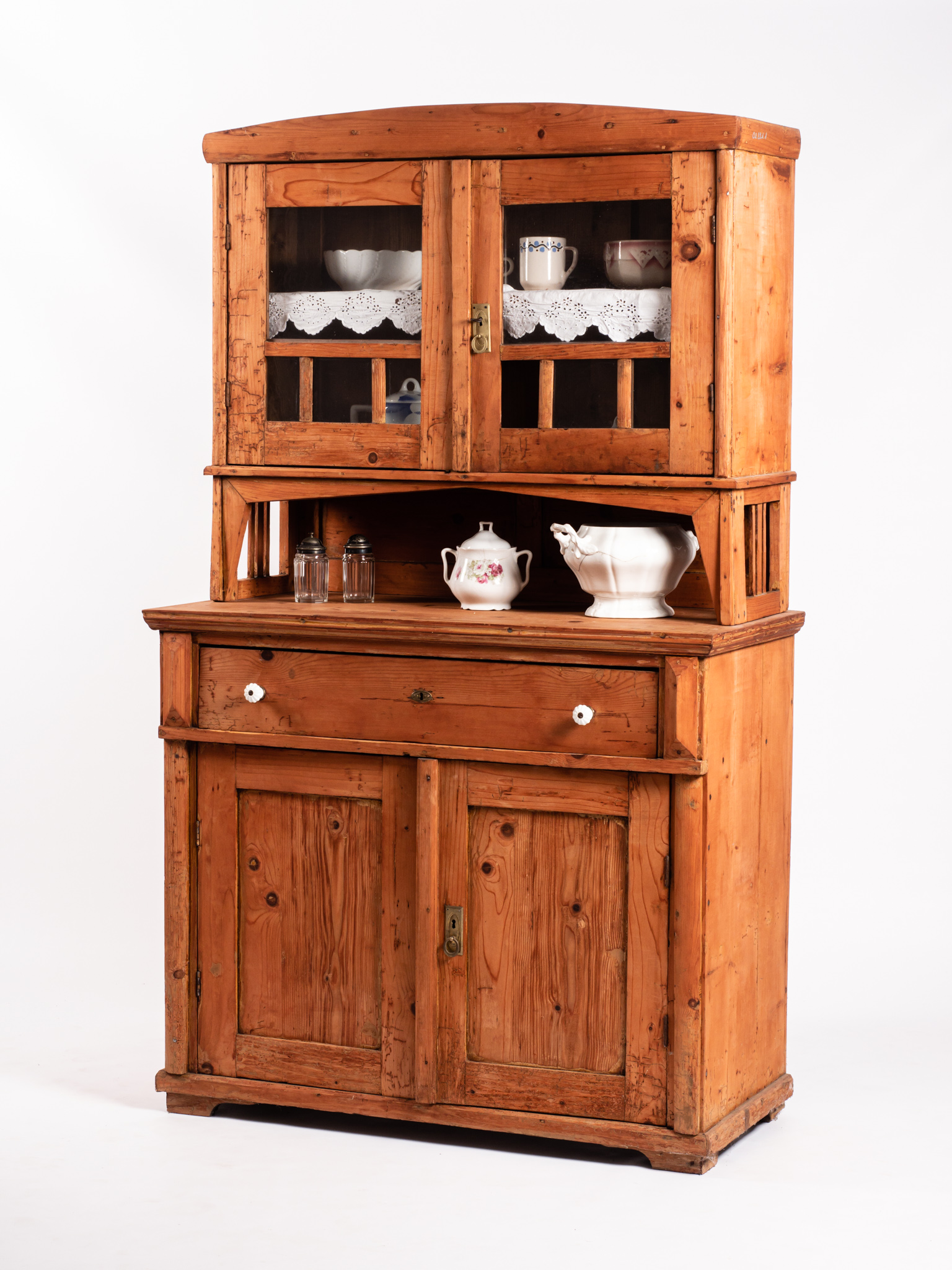 Polcos, alsó része kétajtós, felső része üvegezett, konyhai szekrény, vagy "kredenc", középső részén nagy fiókkal. Edények tárolására használták a 20. század első felében.
