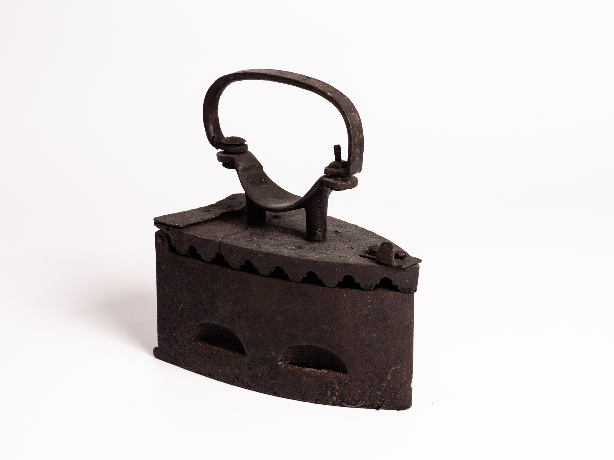 Kovácsoltvas, öntödében készült, faszénnel működő vasaló, két oldalán huzatnyílásokkal. Fogantyújáról a faburkolat hiányzik. Fedele repedt. Fedelén keresztül izzó parazsat tettek bele, majd lóbálták. Az így keltett légáramban a parázs fölizzott,és átforrósította a vasalót. A szenesvasalókat az 1950-es évektől kezdték felváltani az elektromos vasalók.